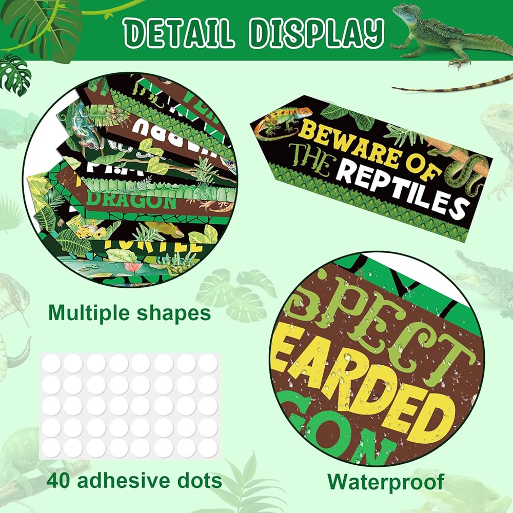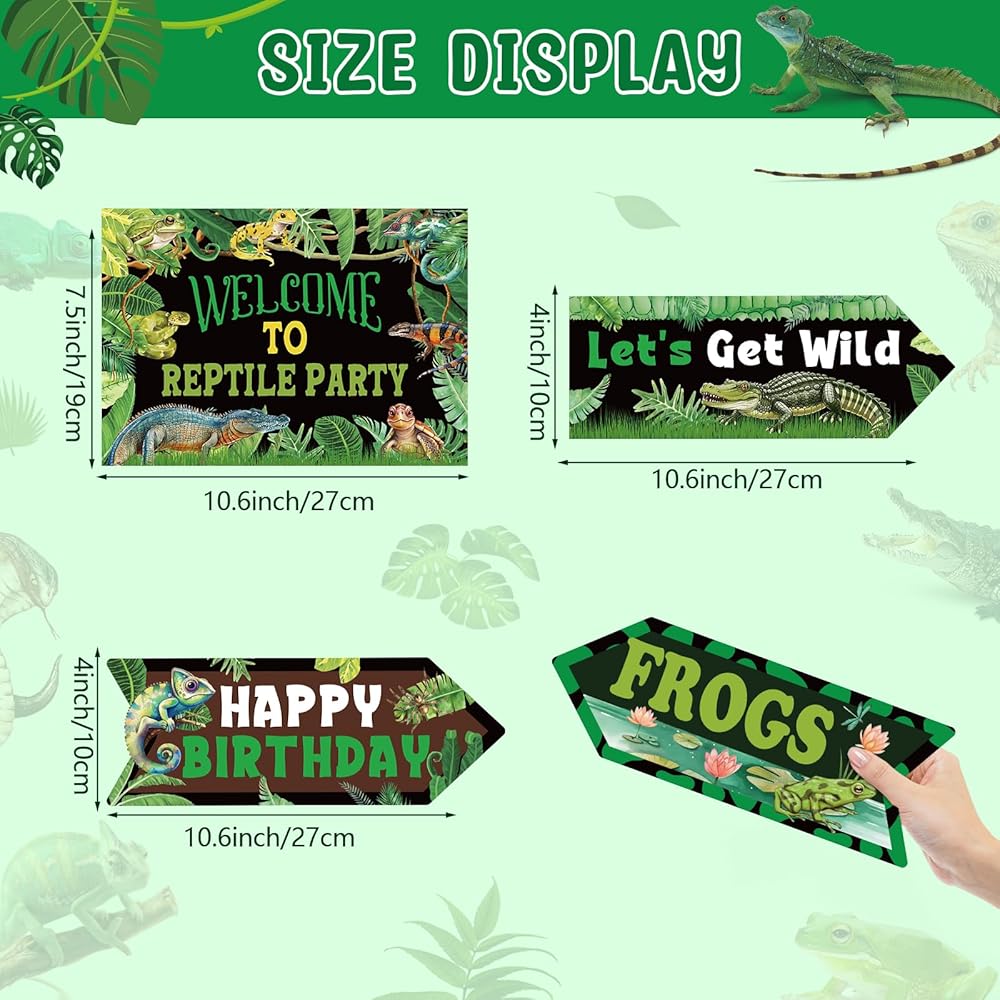 Suitable size: Reptile party signs are available in different sizes as shown and can be affixed to walls, windows, porches, doors, used as entrance welcome signs, directional signs, photo booth props, etc. Designed with a wild scene and a variety of reptiles, they can easily be incorporated into any reptile decorations