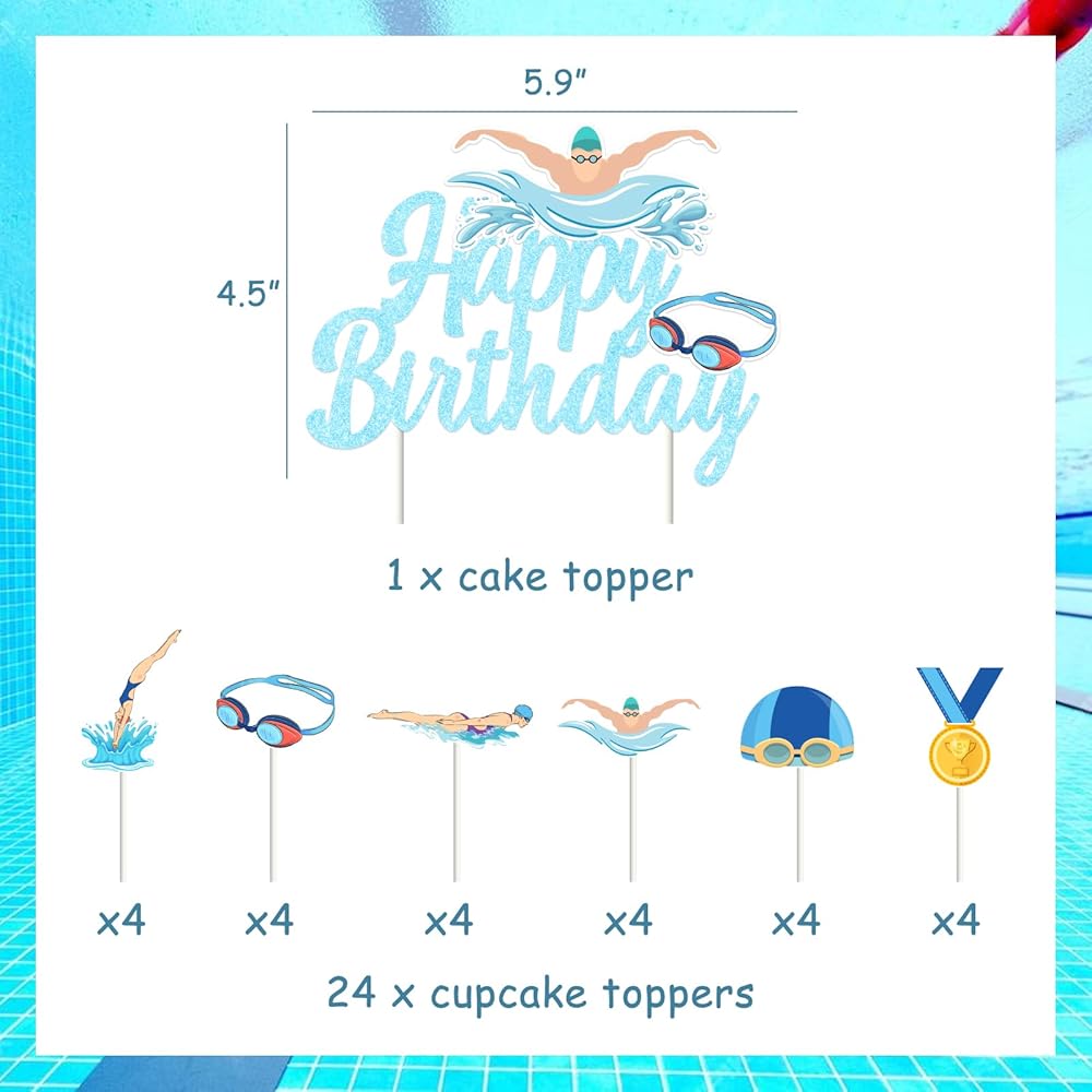 Swimming Birthday Cake Decorations: You will get 1 swimming “Happy Birthday” cake topper 5.9*4.5 inches and 24 swim themed cupcake toppers. And they are packed with box and there is a back card to protect it.