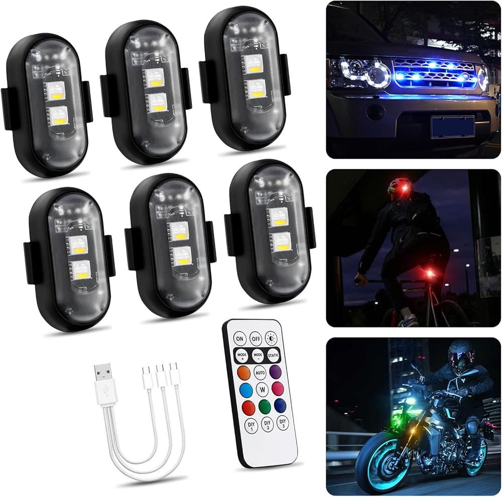 1797 Wireless LED Strobe Lights with Remote Control 8 Colors Anti-Collision Emergency Warning Flashing RGB Mini Light for Cars Trucks Motorcycles Bikes USB Rechargeable 6PCS
