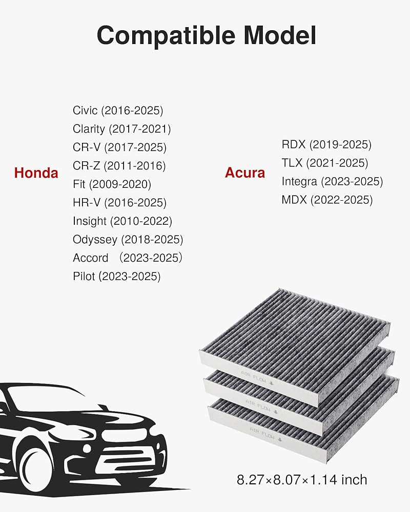 Compatible Replacement: Our cabin air filter is compatible with Honda: Civic (2016-2024), Clarity (2017-2021), CR-V (2017-2024), CR-Z (2011-2016), Fit (2009-2020), HR-V (2016-2024), Insight (2010-2022), Odyssey (2018-2024), Accord (2023-2024). Acura: RDX (2019-2024), TLX (2021-2024), INTEGRA (2023-2024), MDX (2022-2024).