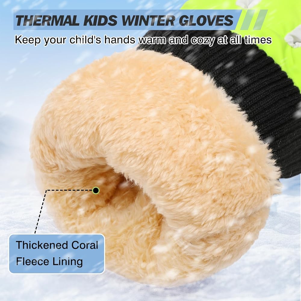 Windproof & Warm Winter Gloves: The kids gloves are made of high quality polyester and PU material, which can effectively withstand the cold weather. The soft lining keeps your child's hands warm at all times. There are knitted elastic cuffs with magic tape design to make the gloves fit the hands better and prevent the cold wind. Warm and cosy gloves allow your child to enjoy winter outdoor activities with ease.