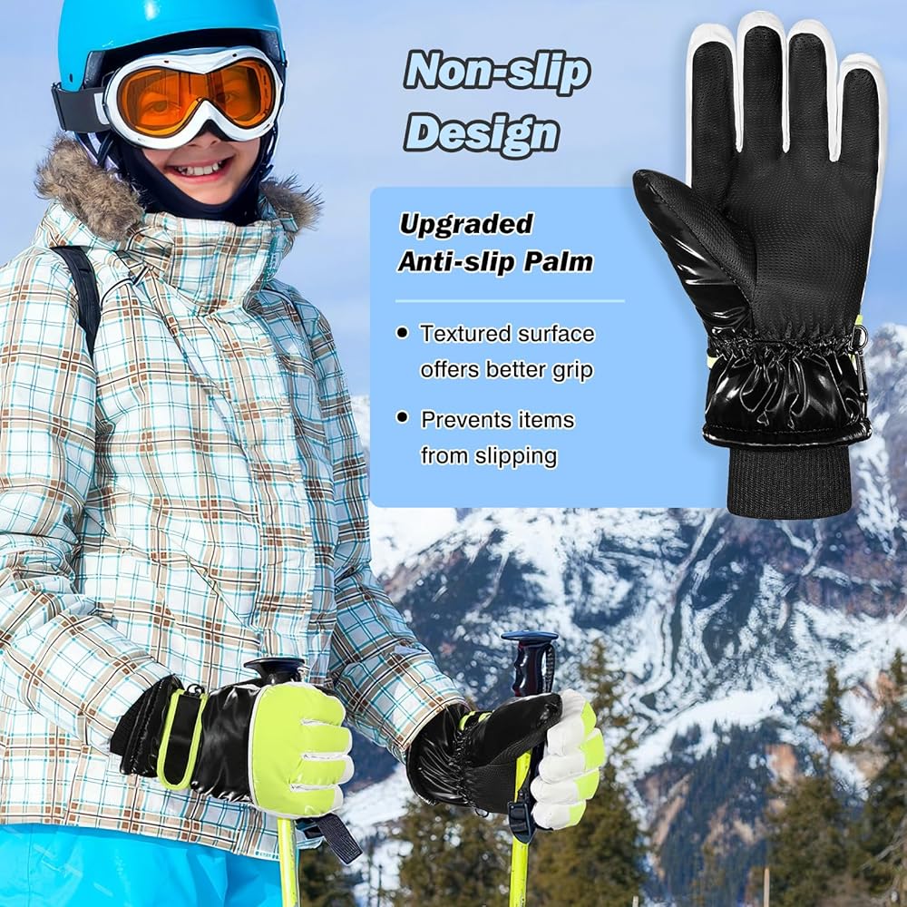 Non-slip Design Snow Gloves : The kids snow gloves are designed with PU fabric on the palm to increase friction, making them non-slip and safer. These kids ski gloves can help children grip ski poles and other activity equipment better, reducing the risk of slipping and injury.