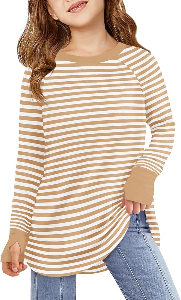 Features: Long sleeve shirts for girls loose fit, casual pullover tunic round neck tops with thumb holes, casual t-shirt, crew neck sweatshirt for kids, cute fall tops with curved hem, classic stripe colors top. The curved hem will bring some much needed “oomph” to your day-to-day looks