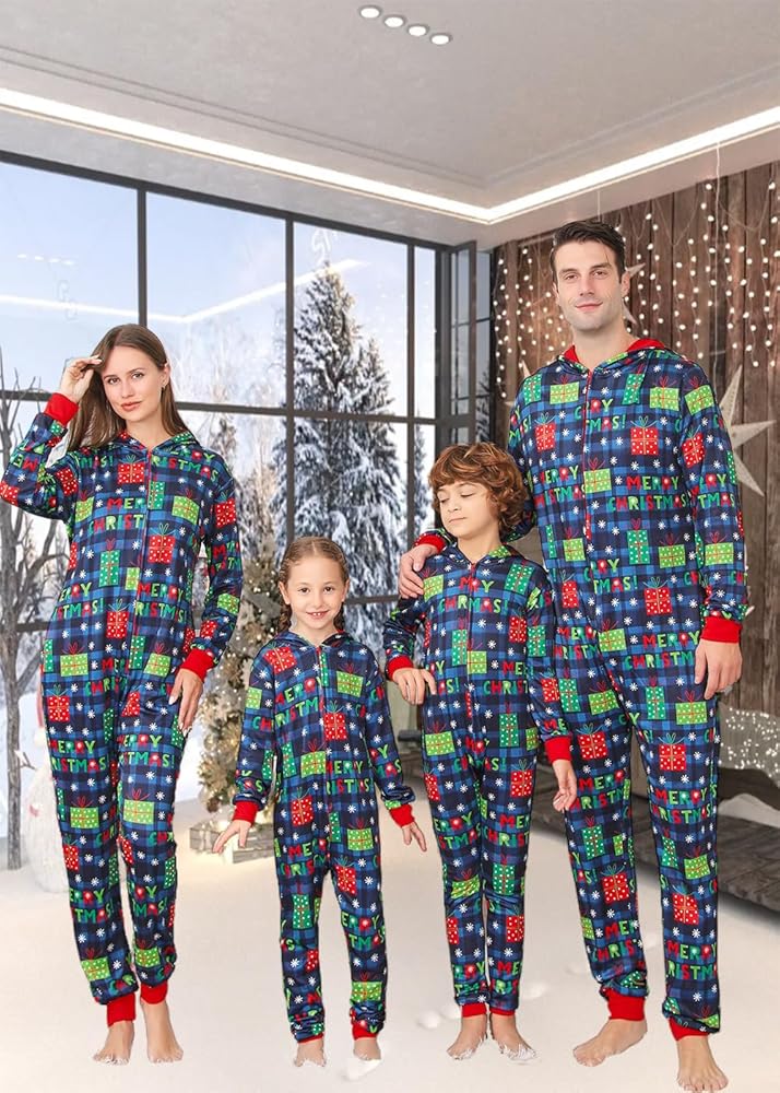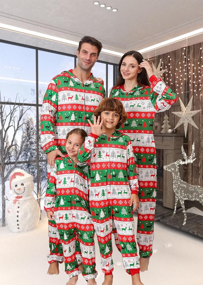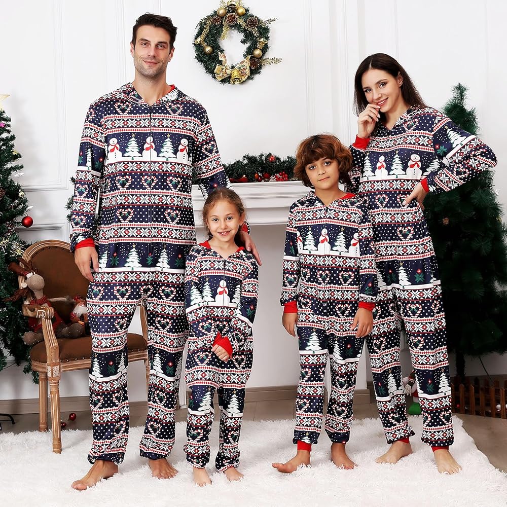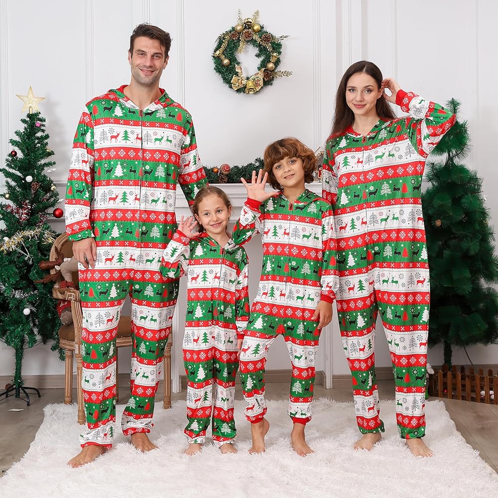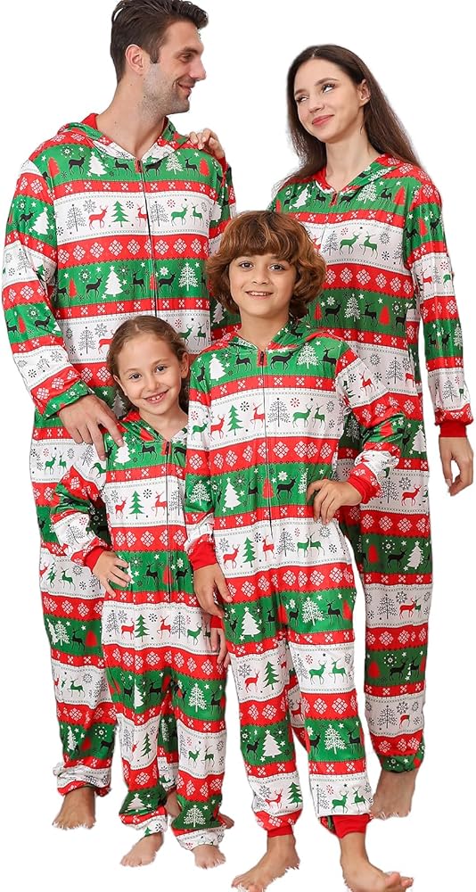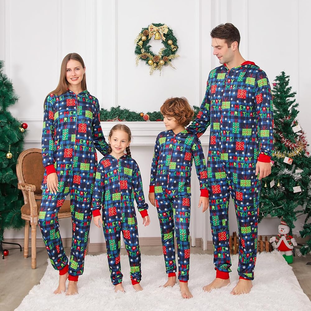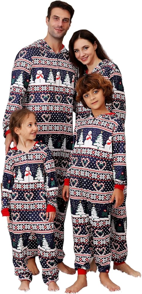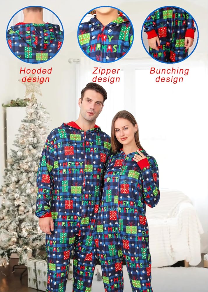 【Unique print design】onesie adult pajamas designed from holiday-inspired, with Christmas element printed, Christmas tree, green dinosaur, Christmas snowman, gift box and reindeer print, long sleeve hoodies style, full zippers for easy wearing, This unique christmas Onesie for family features elastic cuffs at the wrists and ankles to prevent heat from escaping.Cozy and loose Christmas one-piece pajamas are designed to fit the whole family.