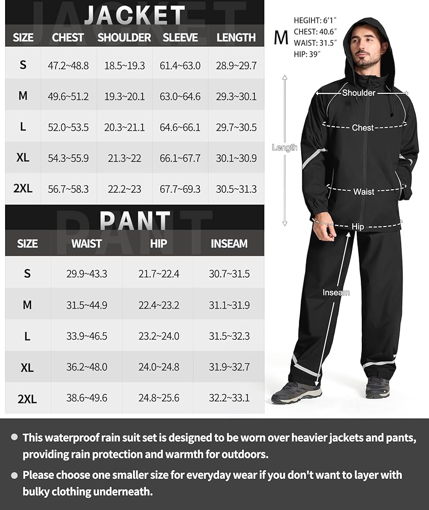【Everyday Wear】The rain suit is perfect for golf.Not tight but enough room for swinging golf clubs,allowing for a full range of motion without feeling restricted.Also it allows for space underneath for regular clothes,so if you don't want to wear bulky clothes, please choose a smaller size for daily wear.Consult our size chart to find the perfect fit