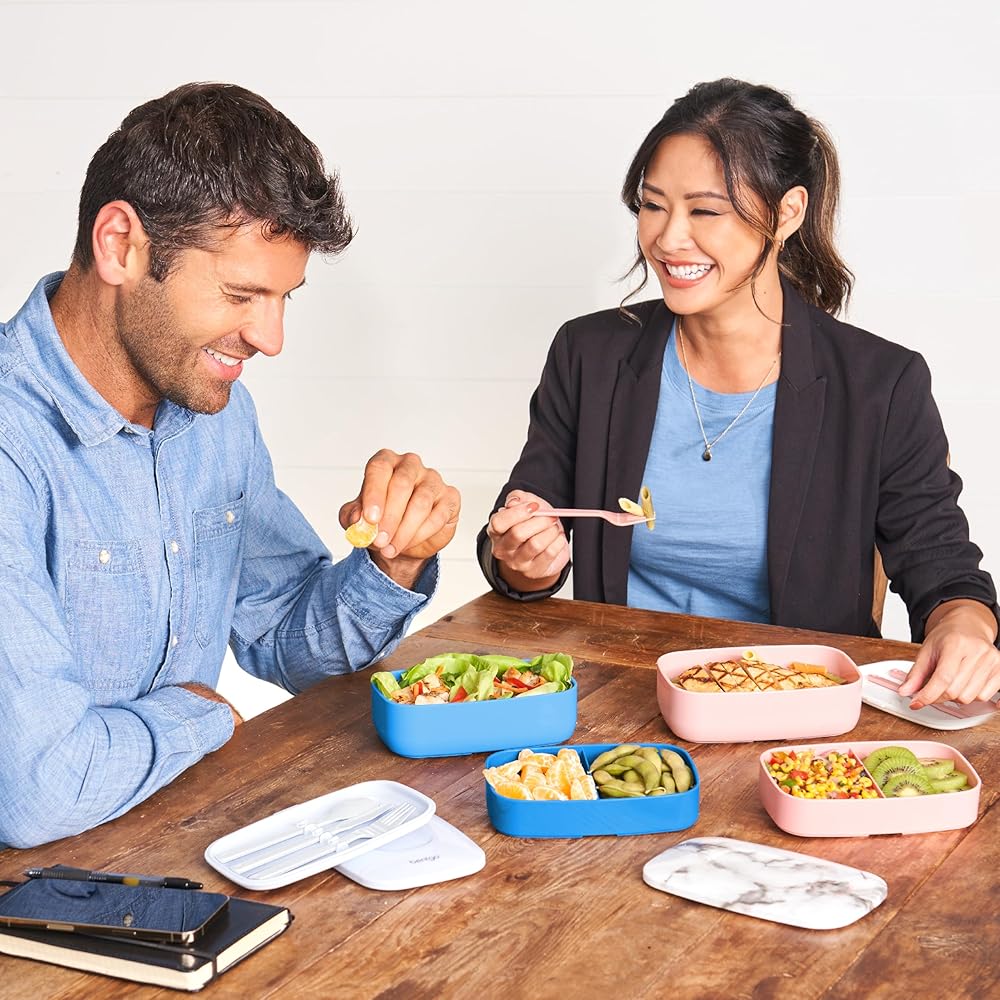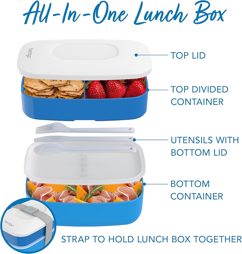 All-in-One Lunch Container: Don't worry about forgetting utensils or having to pack multiple lunch containers – this convenient all-in-one bento box includes a plastic utensil set and three different food compartments held together with a nylon strap.
