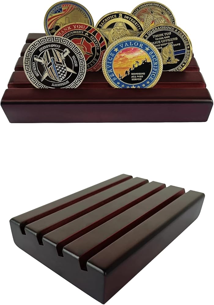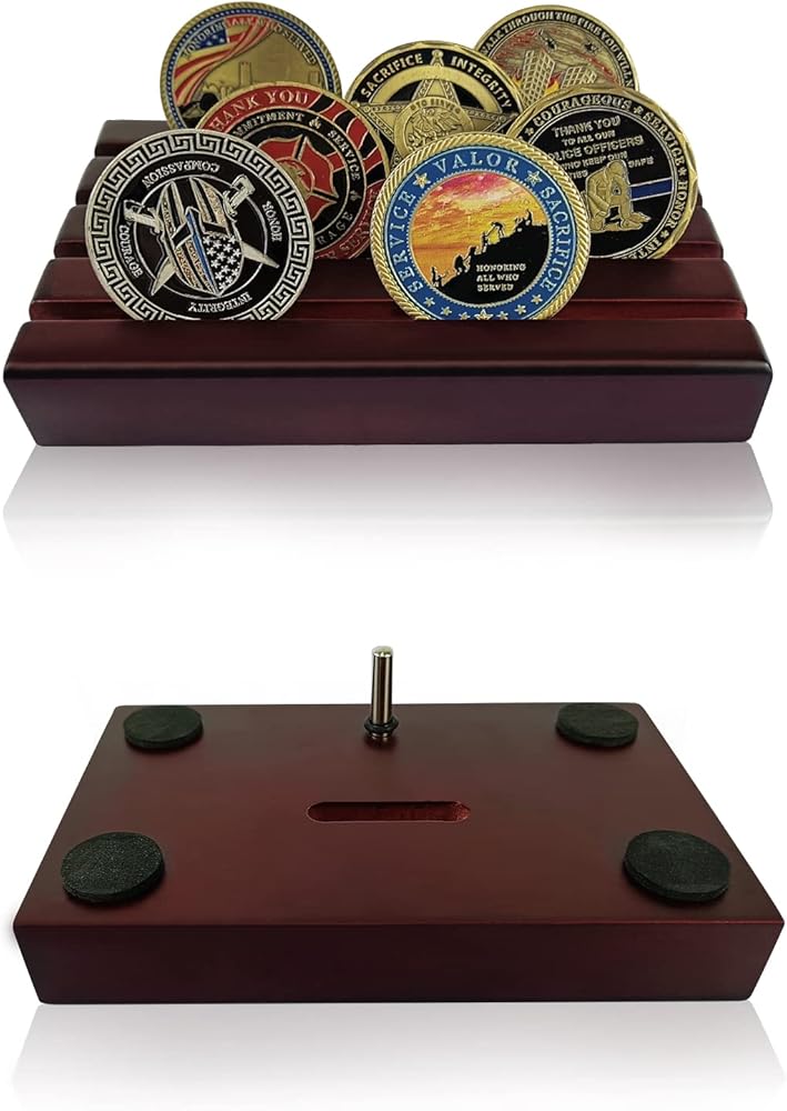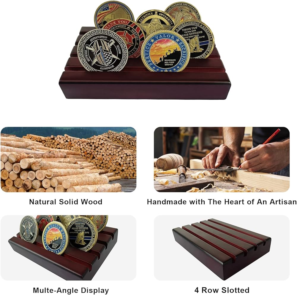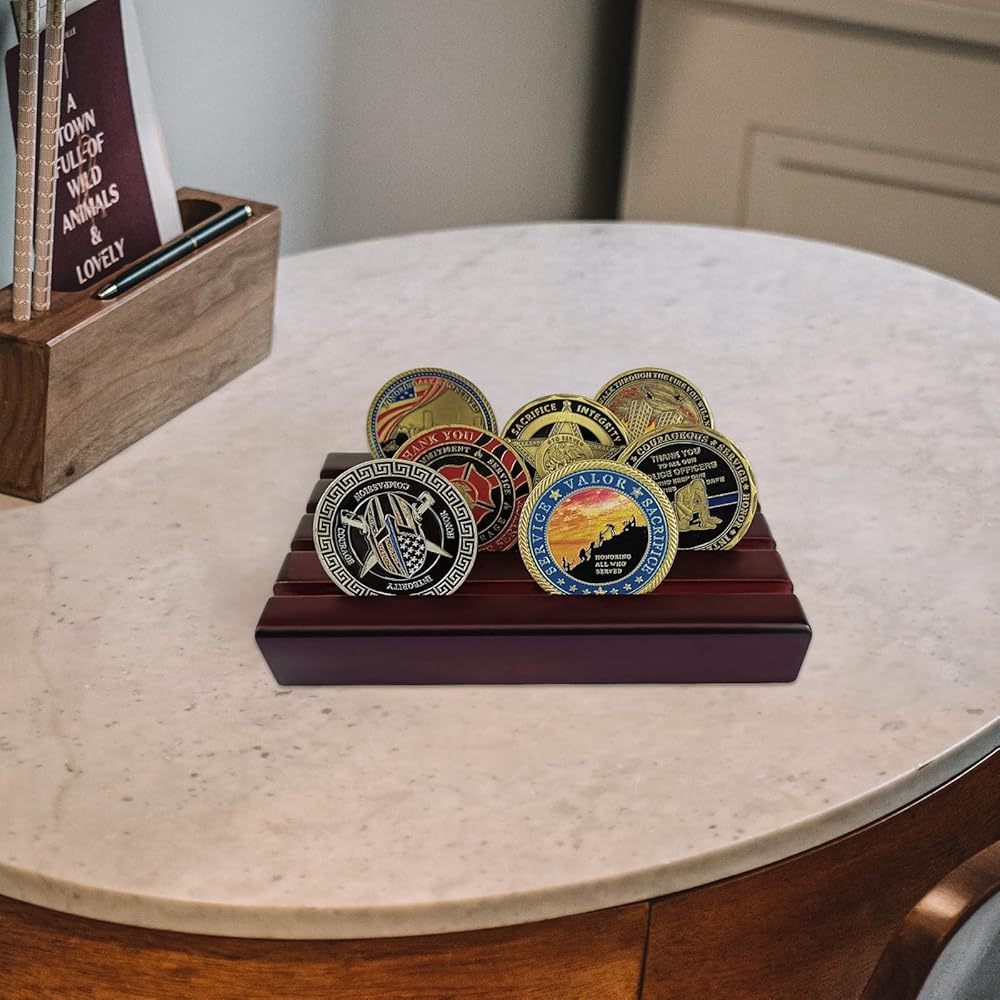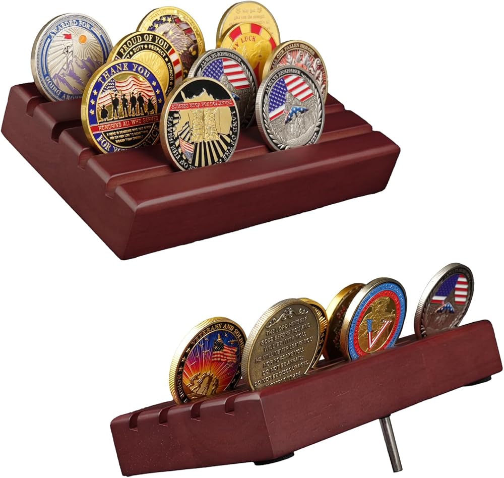 CLASSIC DESIGN: 4 Rows military challenge coins stand that provide convenient inclination to show each row with coins from any angle,this challenge coin rack can hold 30 coins depending on your coin sizes. A great way to showcase coins of various size, military challenge coins, custom coins or casino chips