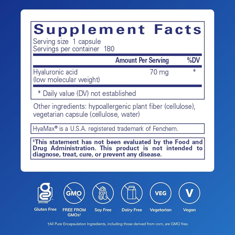 Skin Hydration: Pure Encapsulations Hyaluronic Acid supports youthful skin and hydration, as well as joint function and comfort*