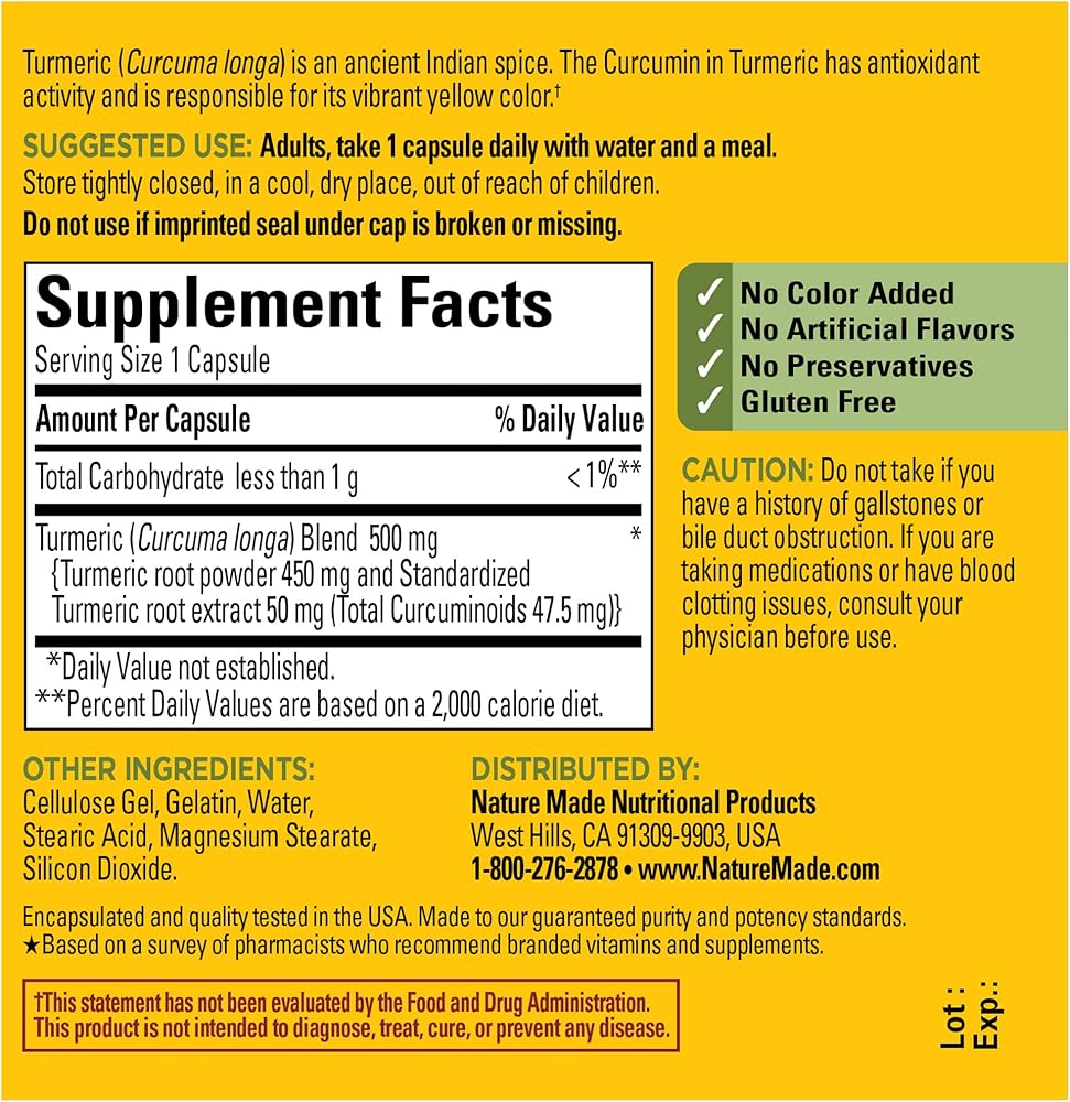Nature Made Turmeric Curcumin 500 mg Capsules are herbal supplements that provide antioxidant benefits for the body. Sourced from high quality ingredients, these gluten free Turmeric Curcumin supplements have no artificial flavors, no color added, and no preservatives. Turmeric is an Indian spice that has been traditionally used for its health properties. This Turmeric supplement is made with standardized Turmeric extract and gets its vibrant yellow color from Curcumin (and some other curcuminoids), which provides antioxidant activity to help neutralize free radicals in the body. These Turmeric 500mg capsules are perfect for those looking for antioxidant benefits. Adults, take one of these Turmeric 500 mg capsules daily with water and a meal. Store these Tumeric supplements tightly closed, in a cool, dry place, out of reach of children. Nature Made supplements are quality you can trust. USP has tested and verified ingredients, potency and manufacturing process. USP sets official standards for dietary supplements. Visit the USP verified website for more information. *Based on a survey of pharmacists who recommend branded vitamins and supplements.