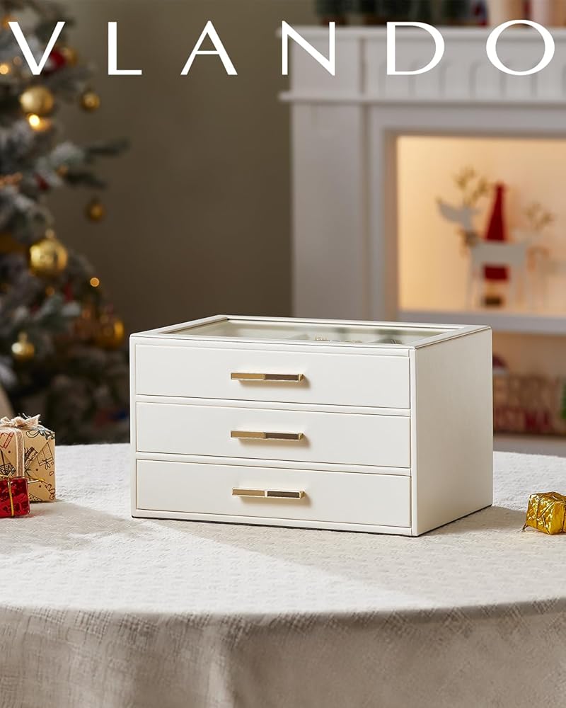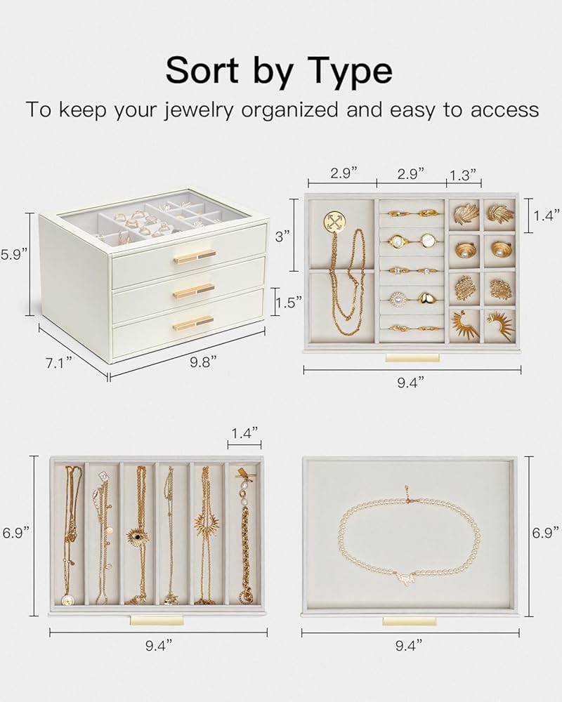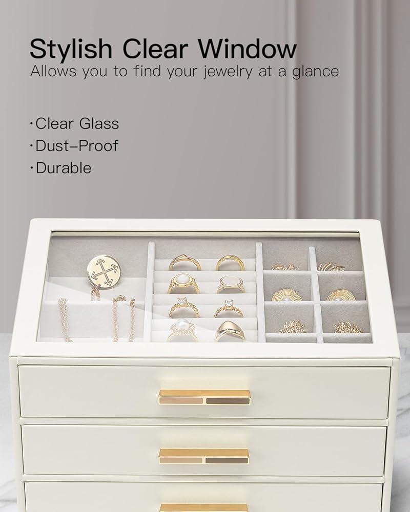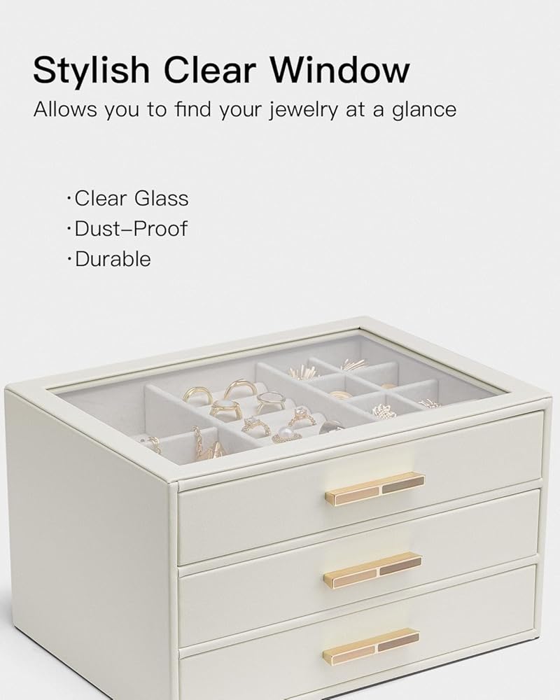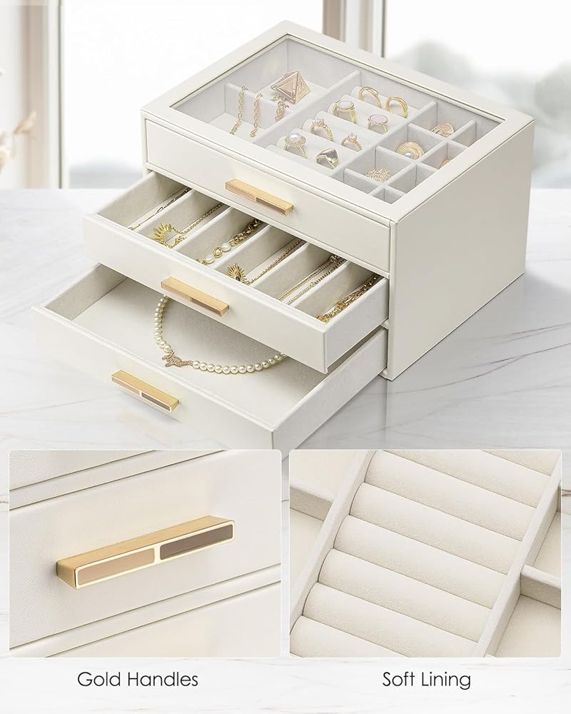 Large Clear Lid - House your favorite jewels under the glass lid so you can always find them at a glance. 3 layer jewelry box with 3 drawers and lots of compartment and with gold hardware, easy to open top and drawers