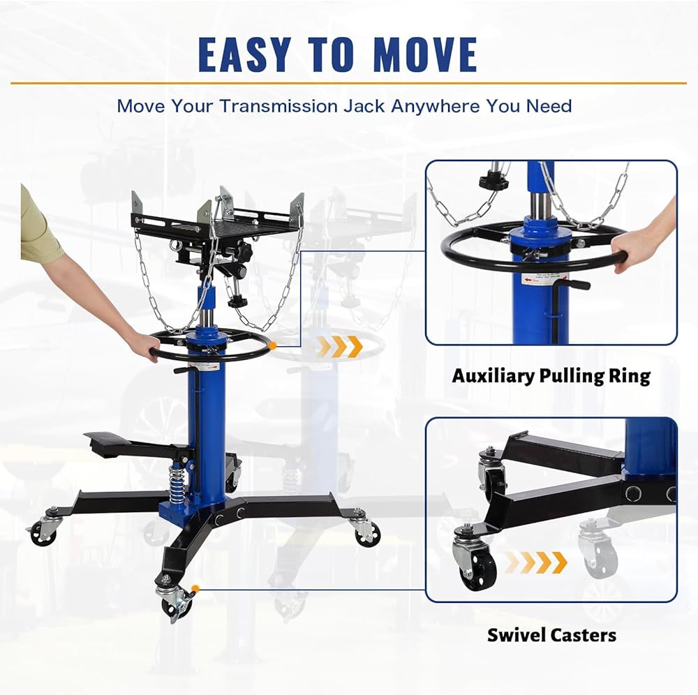 Easy to Move: Our professional hydraulic transmission jack features four swivel casters, ensuring smooth movement and stability when maneuvering between vehicles. An auxiliary ring positioned at the center of the jack further enhances mobility, making it easy to push or pull by hand during transport.