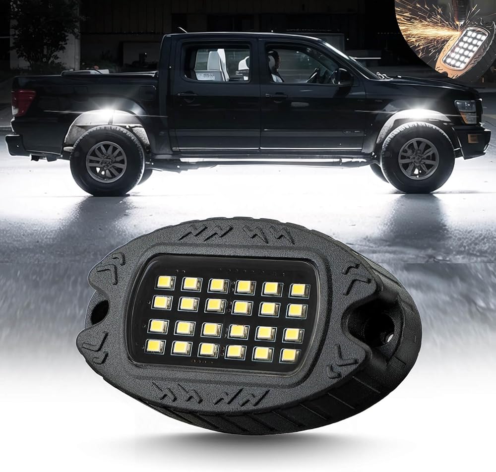 True Pure White Light: The rock lights for trucks white utilize high brightness LED chips and undergo precise color calibration for the white light, resulting in an exceptionally clean and pure white light. Unlike other rock lights that emit mixed white light, which may appear bluish or yellowish, the rock lights produce a truly pure and neutral white light.Decorating your vehicle with these rocklights will undoubtedly make your truck, ATV, or SUV exceptionally eye catching