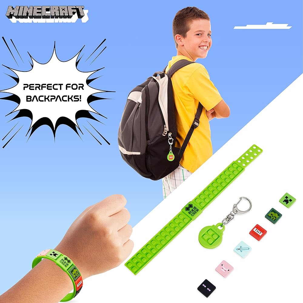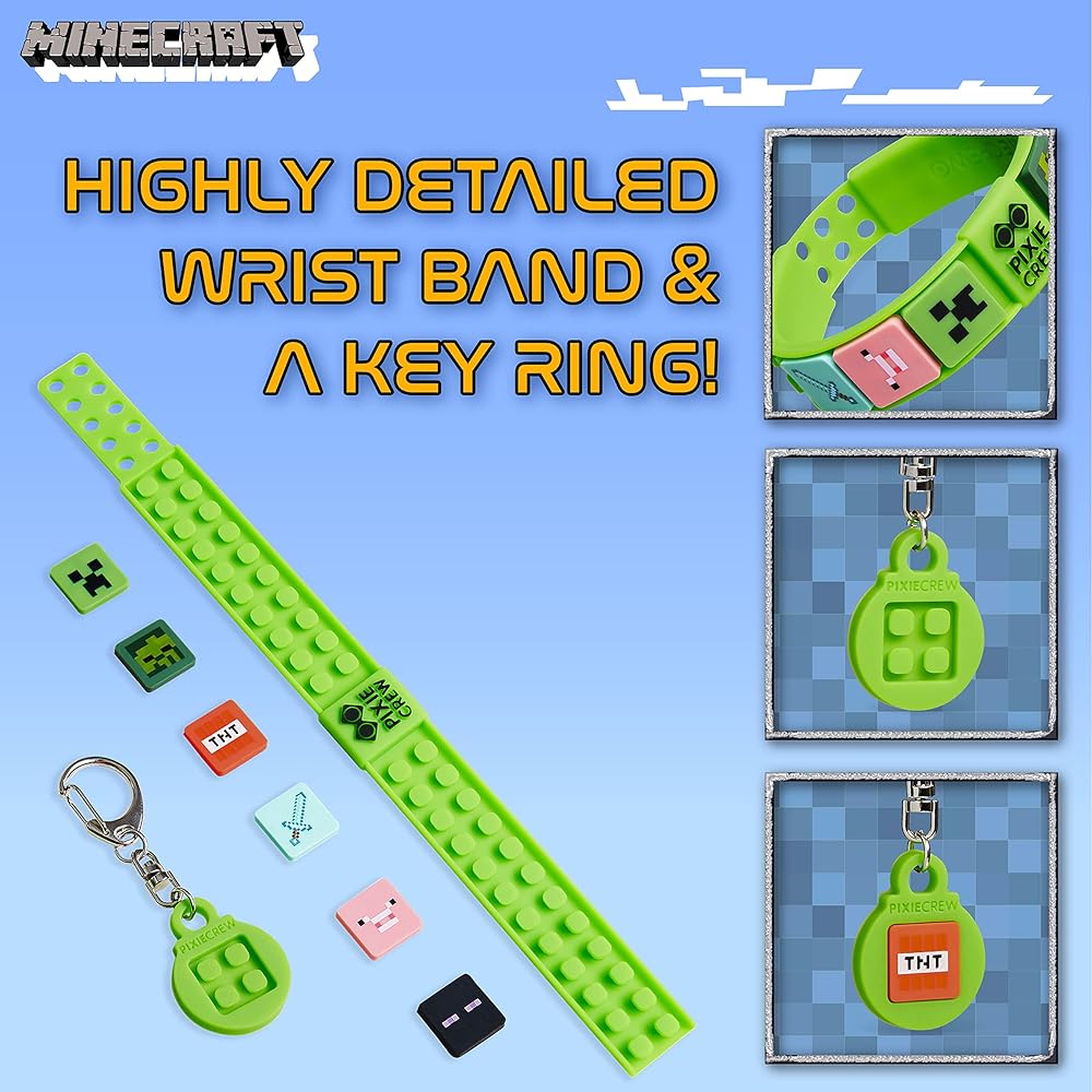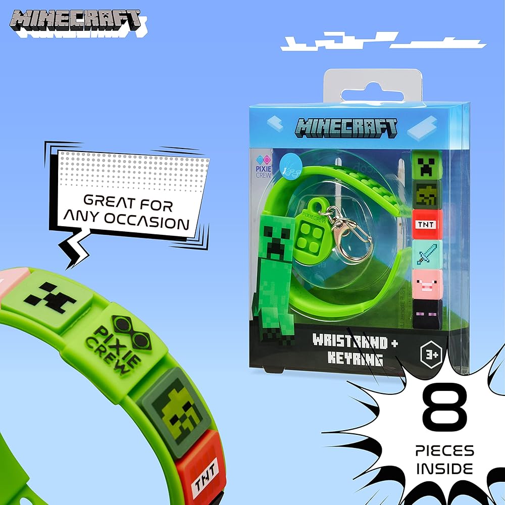 Wristband and Keyring Set: This set includes 1 silicone bracelet, 1 Minecraft keyring and 6 pixel tiles. Kids can pop the tiles on and off to customise their accessories and create their own unique designs
