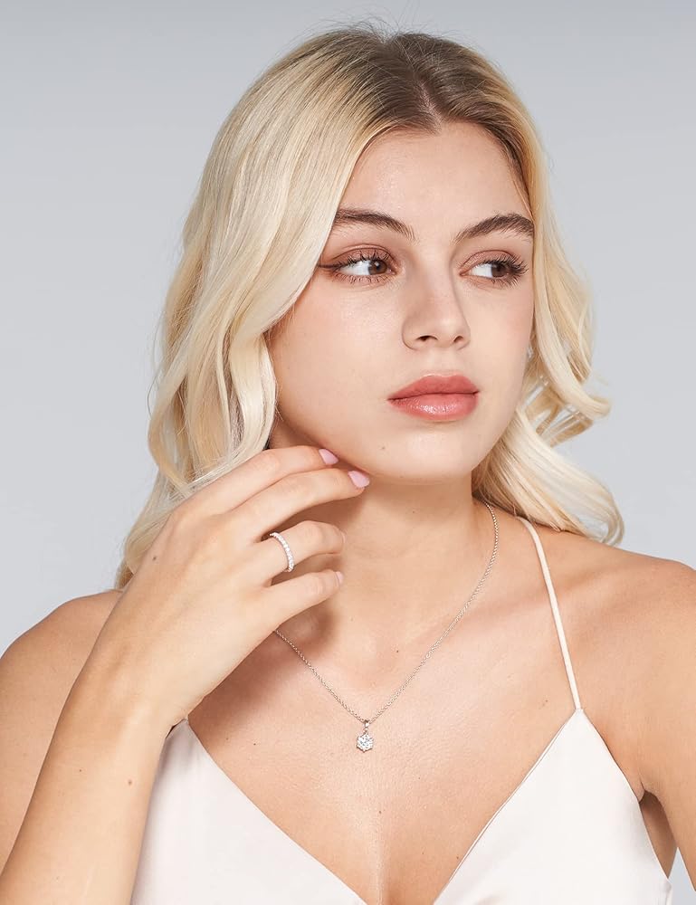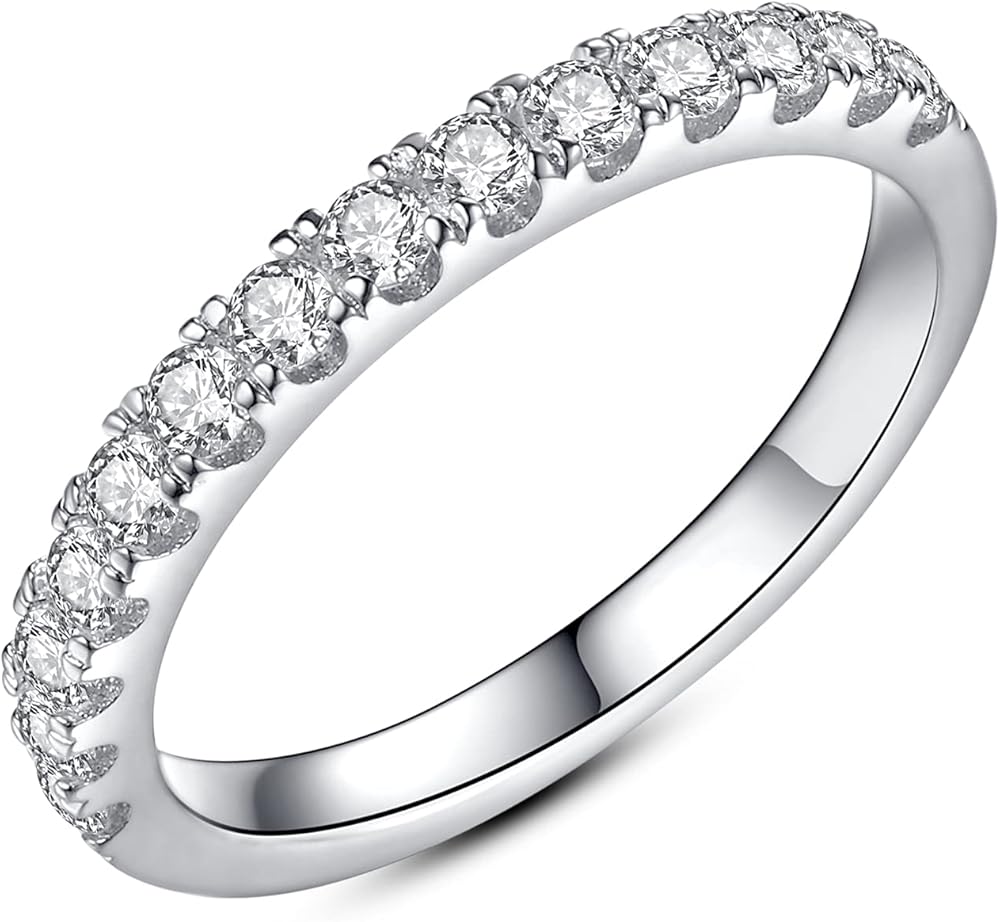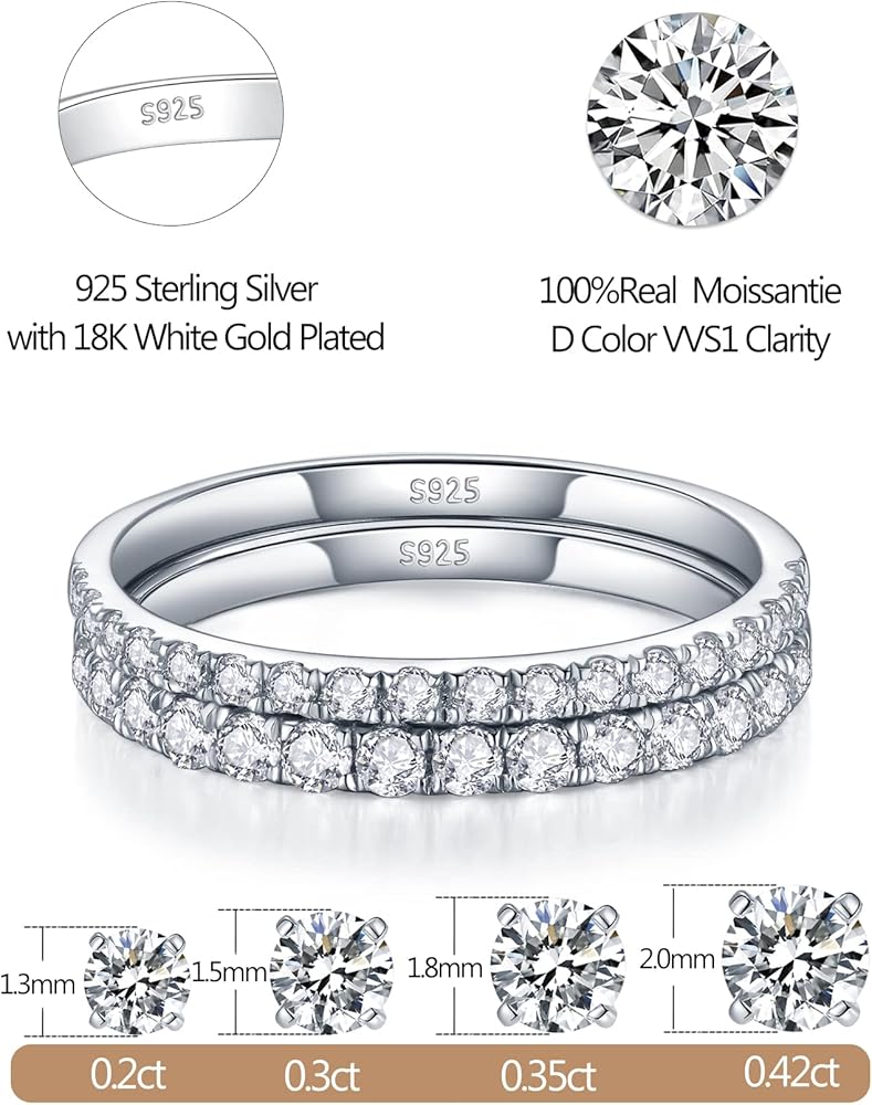 【Top Grade Moissanite with More Sparkle】-This moissanite diamond band is made of 100% REAL MOISSANITE, which is as hard as natural diamond. It has greater fire and brilliance than any other gemstones. Also,it won't tarnish or discolor while it is more cost-effective than diamond. The metal of the ring is 925 sterling silver with 18K White Gold Plated, which is 100% Hypoallergenic, Lead-free & Nickel-free.