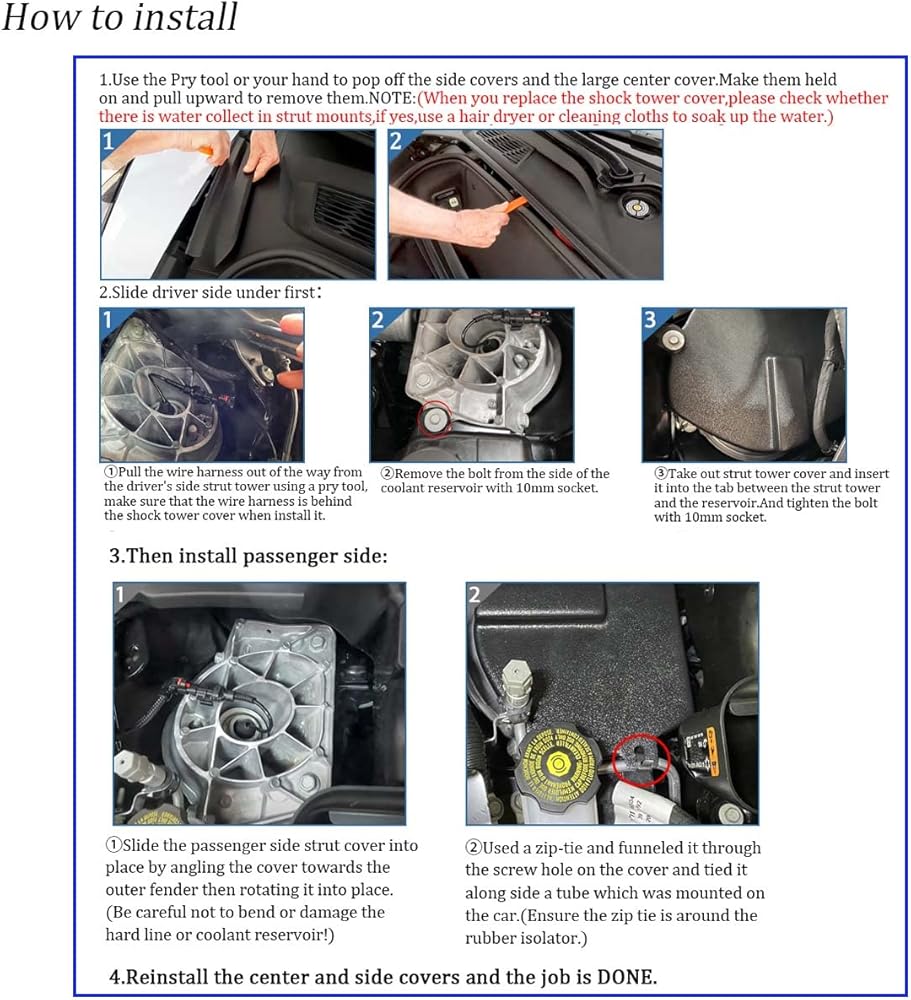 Please ensure that your reservoir cap is not leaking fluid prior to installation of the passenger side strut tower cover.Our front strut could prevent water from entering the pillar tower,preventing the accumulation of water from causing rust on the top nuts and bolts,provide an excellent protection for your car.