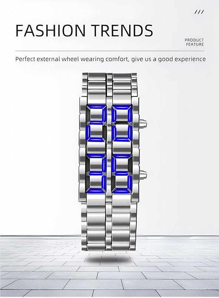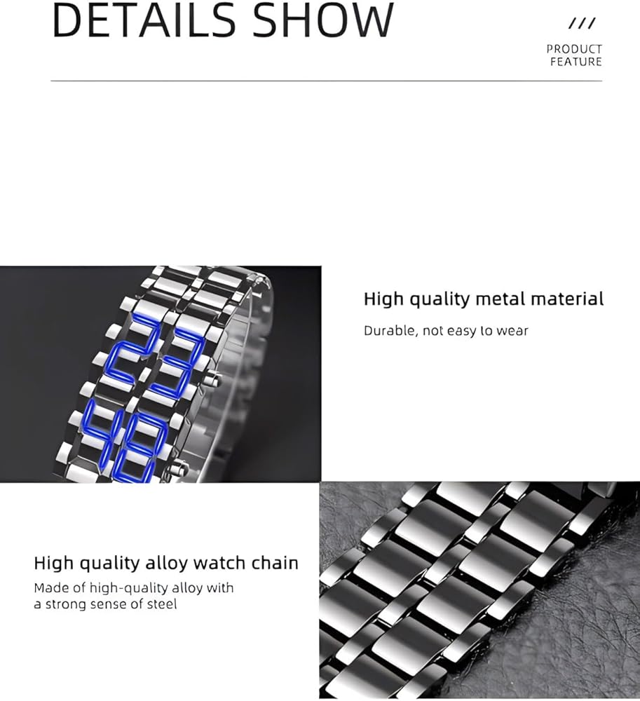 LED Digital Watch looks like a common metal bracelet at normal condition, but dark-blue light will be sent out just like lava while LED is lighting.