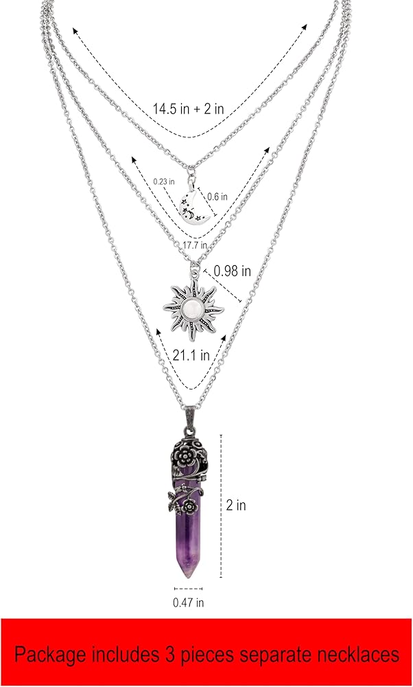 SIZE & LENGTH: Moon pendant size is 0.23 inches in width x 0.6 inches in length, Sun Pendant size is 0.98 inches in diameter, The Black Crystal Pendant size is 0.47 inches in width, 2inches in length. The first chain is 14.5 inches, second chain is 17.7 inches, the third chain is 21.2inches. Extender chain: 2 inches