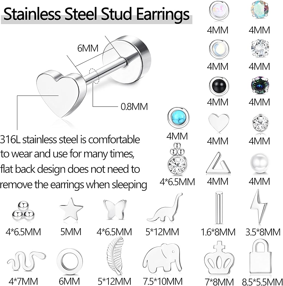 Small Stud Hoop Earrings Set for Multiple Piercing--You will get single 25PCS comfy tiny gold earrings,including ball cartilage earrings,emerald CZ flat back stud earrings,star flatback stud earrings,heart screw back earrings stud,classic small hoop earrings.Wear these flat back stud earrings and hoops earrings alone or with other earrings will either be great