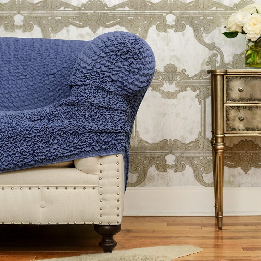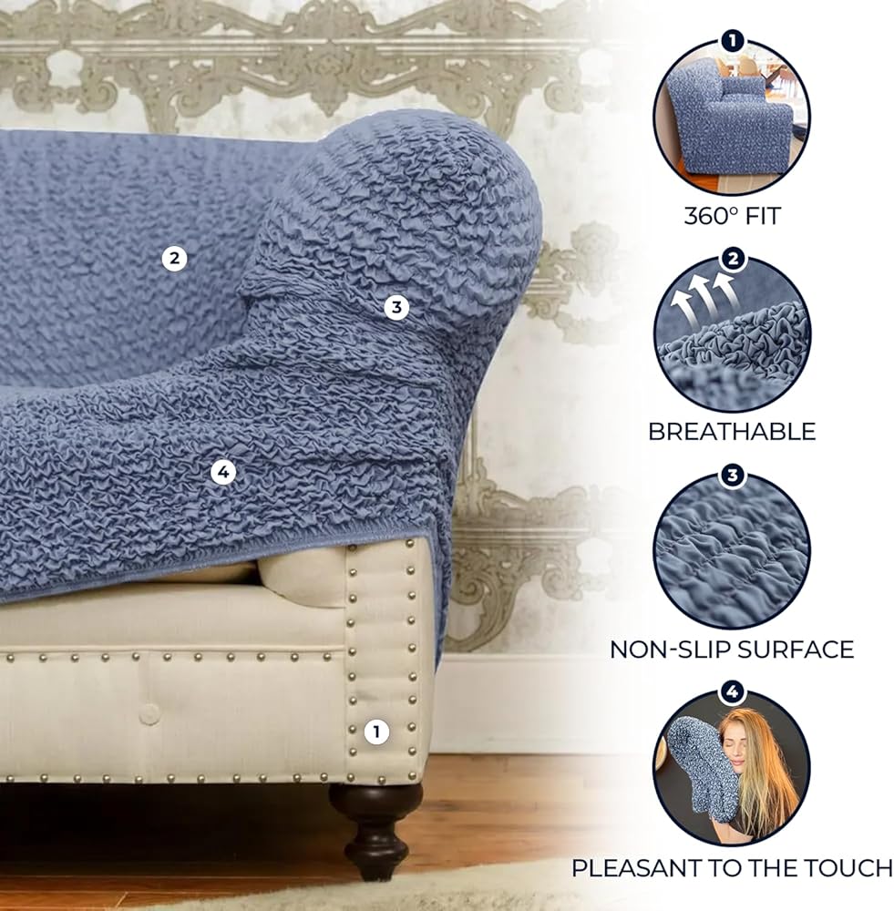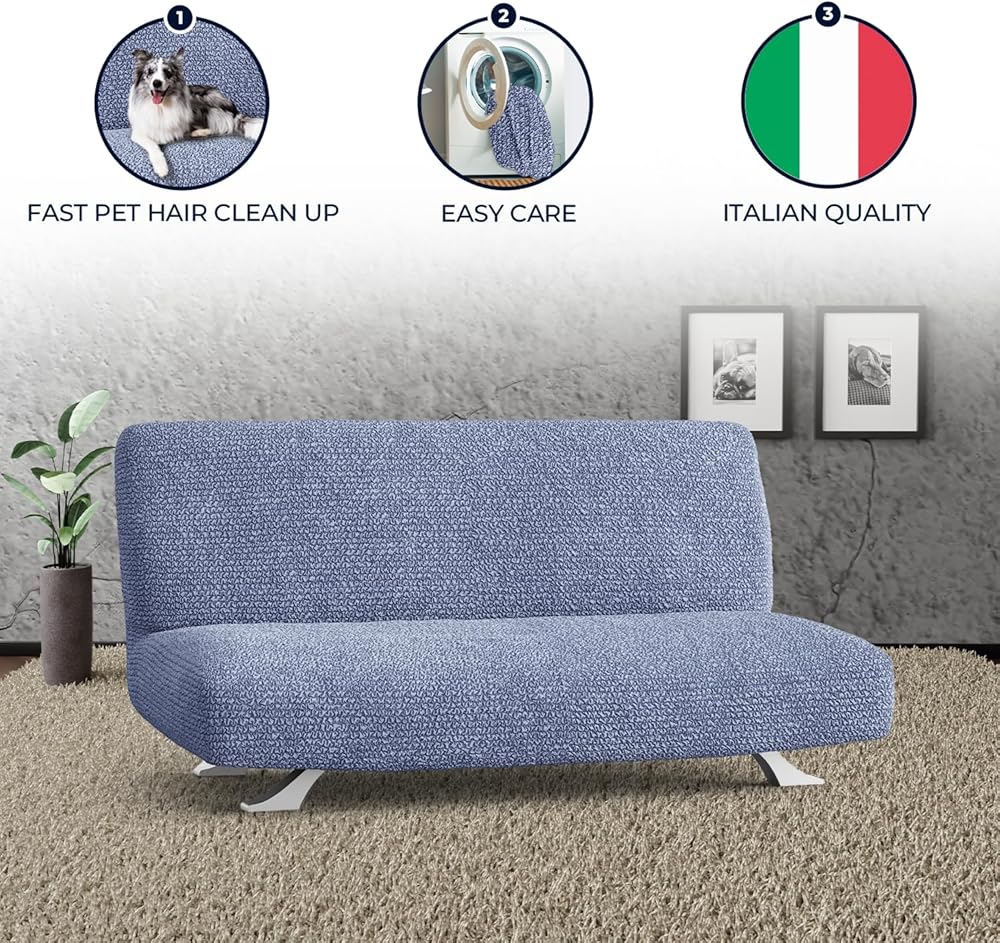 ELEGANT DESIGN: Sofa click clack slipcovers is strapless with an elasticized bottom. Special anti-slip cardboards included. They prevent klik klak slip cover from sliding. Instructions included.