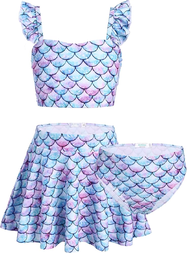 Design: 3-piece girls bathing suit, top+shorts+short skirt, easy to match, 3D printed bright colors, full of vitality, you can choose your girl's favorite.