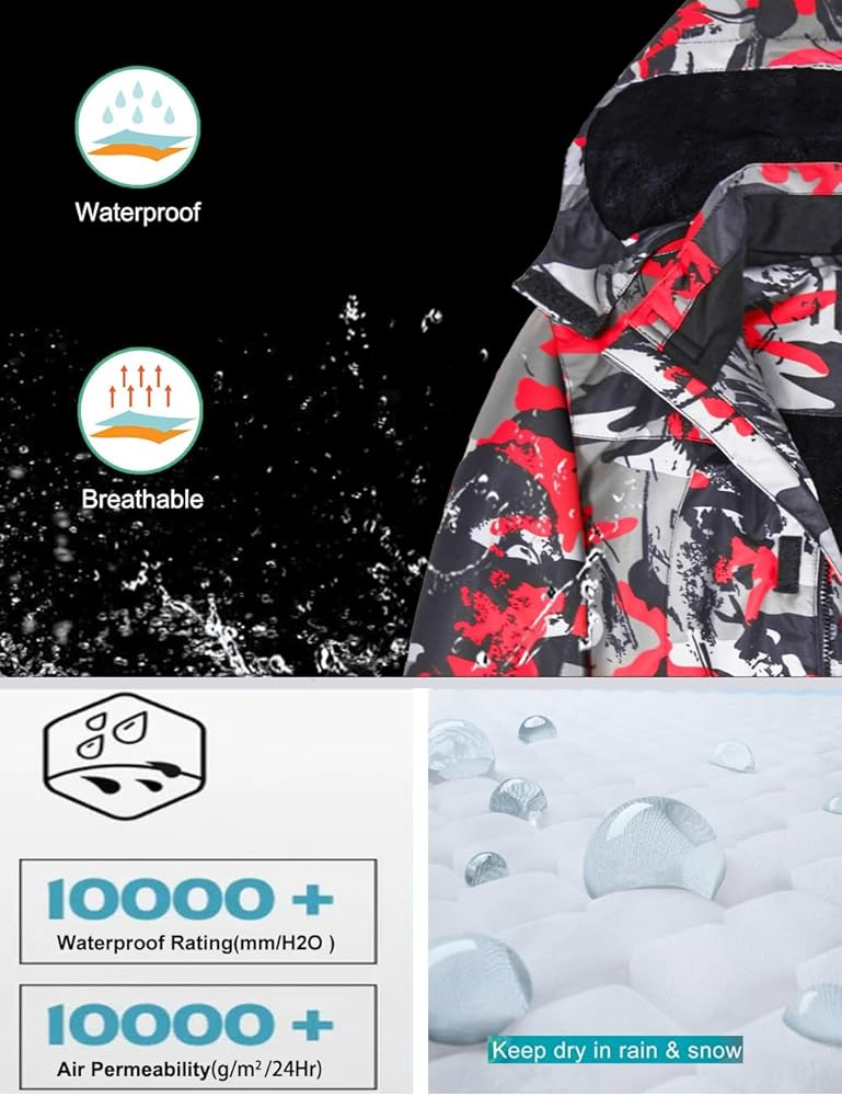 Waterproof Ski Jacket: Durable Water-Repellent (DWR) coating that sheds rain and dries quickly, 10k waterproof rating,always keep the boys ski jacket dry and clean, Air permeability <6mm/s,boys will be well protected from the winter jacket and able to carry on playing in comfort wearing this jacket.