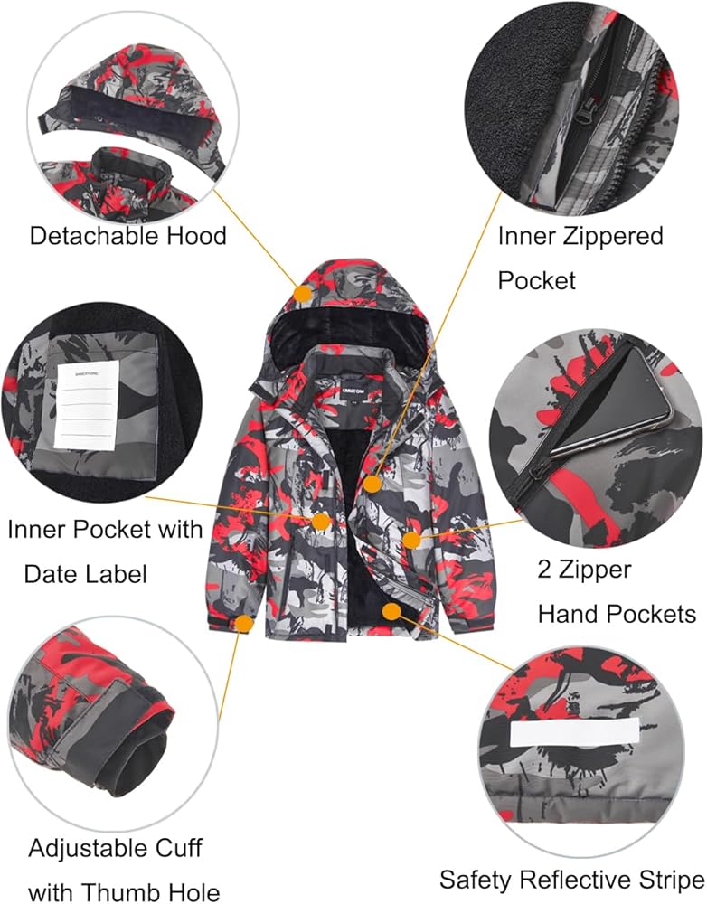 Multi Pockets Snow Jacket: 2 zippered hand pockets with micro-fleece lining,keep hands warm meanwhile great for items like tissues,keys, coins, phone, card etc. 1 internal security pocket keep the essentials secure. 1 inner zippered pocket that store kid's goggles and other accessories.
