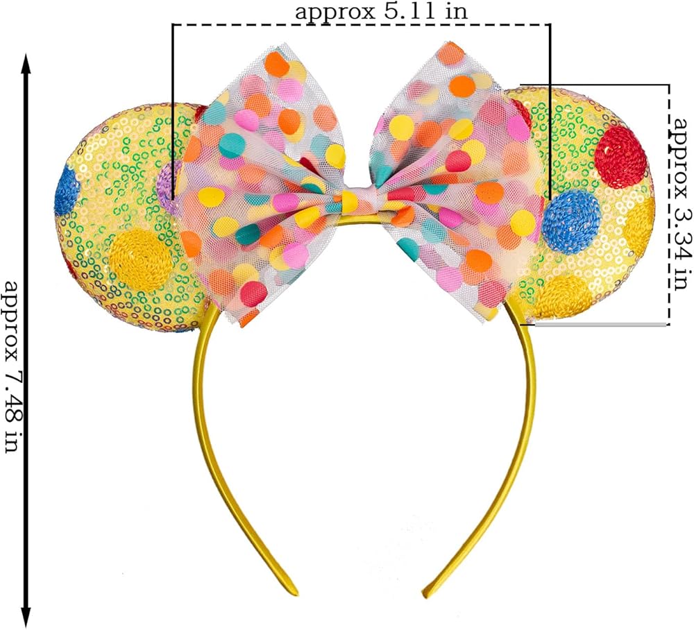 PACKAGE & SIZE: 1 piece of mouse ear headband in a package. The width of the headband part is approx 4.7 inches, the width of the crown part is approx 9.1 inches