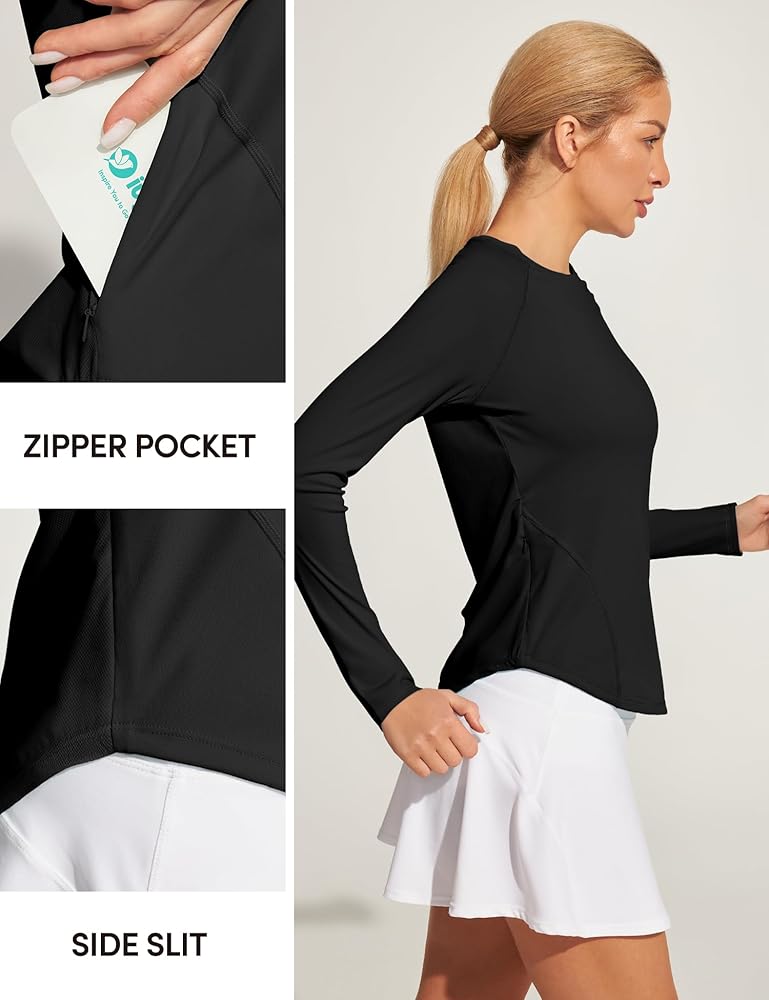 Versatile and Functional - This womens rash guard long sleeve is designed for outdoor activities and is tailored to fit a variety of body types due to its better lateral elasticity. IUGA UPF 50 long sleeve women has a concealed zippered side pocket for securely storing lightweight small items such as cash and keys. Ideal for a day of hiking, walking, outdoor activities, running, and exercise.