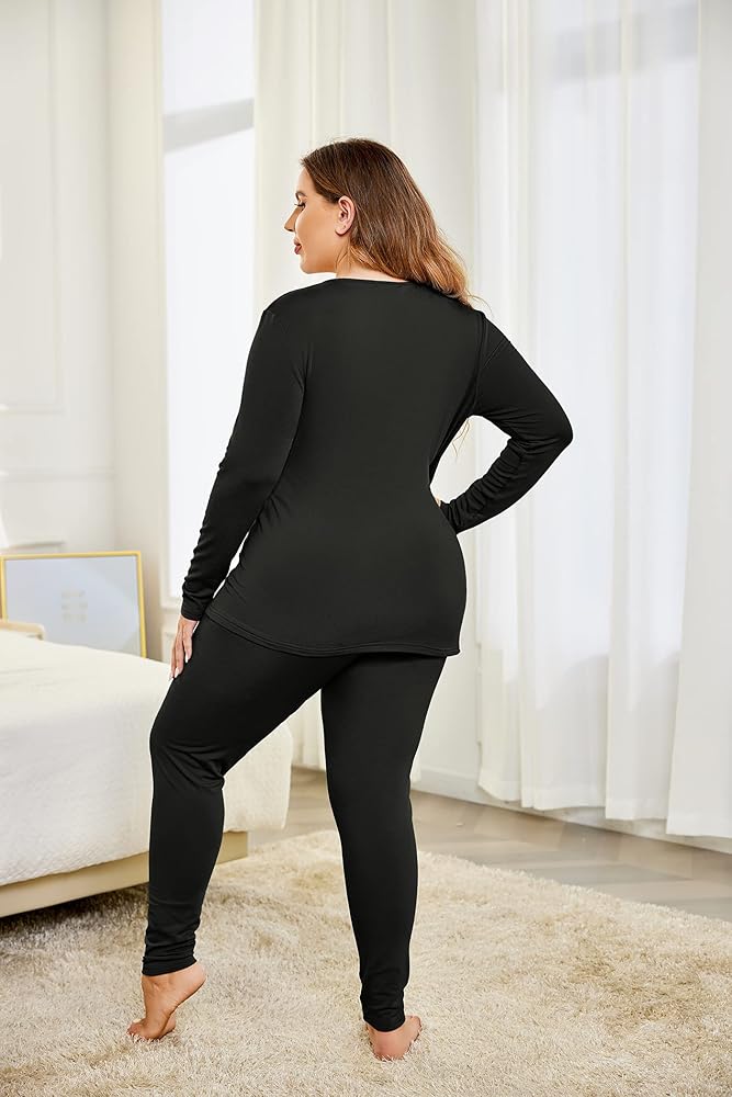 IN'VOLAND Women's Plus Size Thermal Long Johns Sets Fleece Lined 2 Pcs Underwear Top & Bottom Pajama Set Black