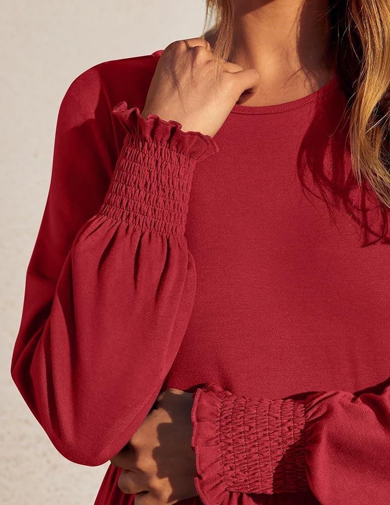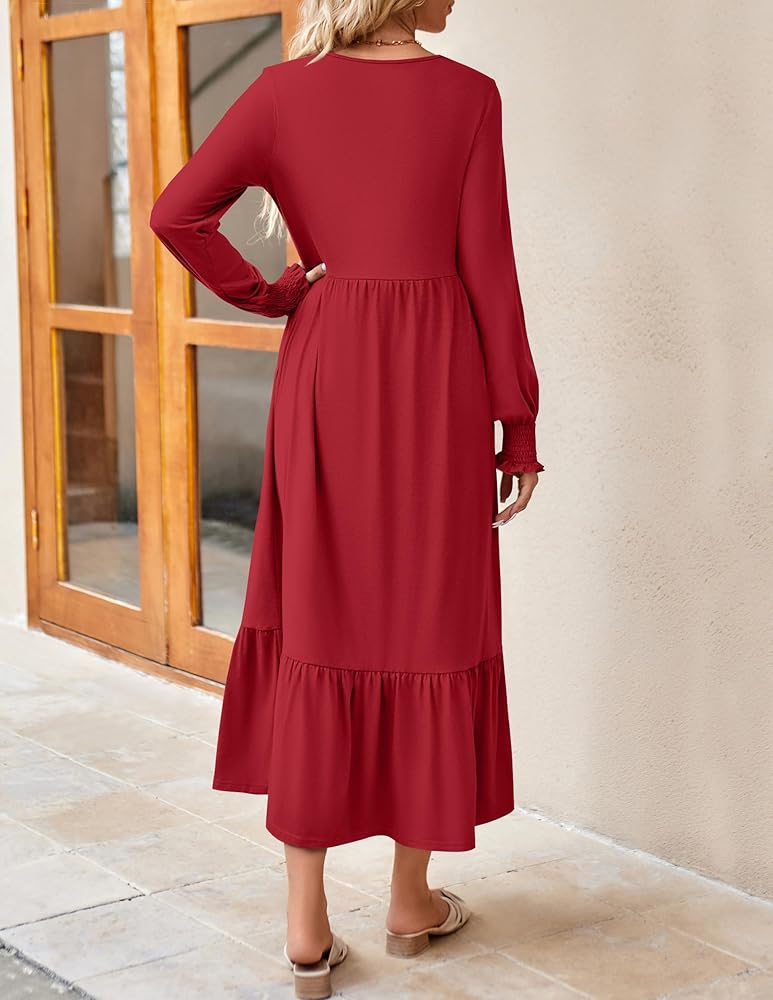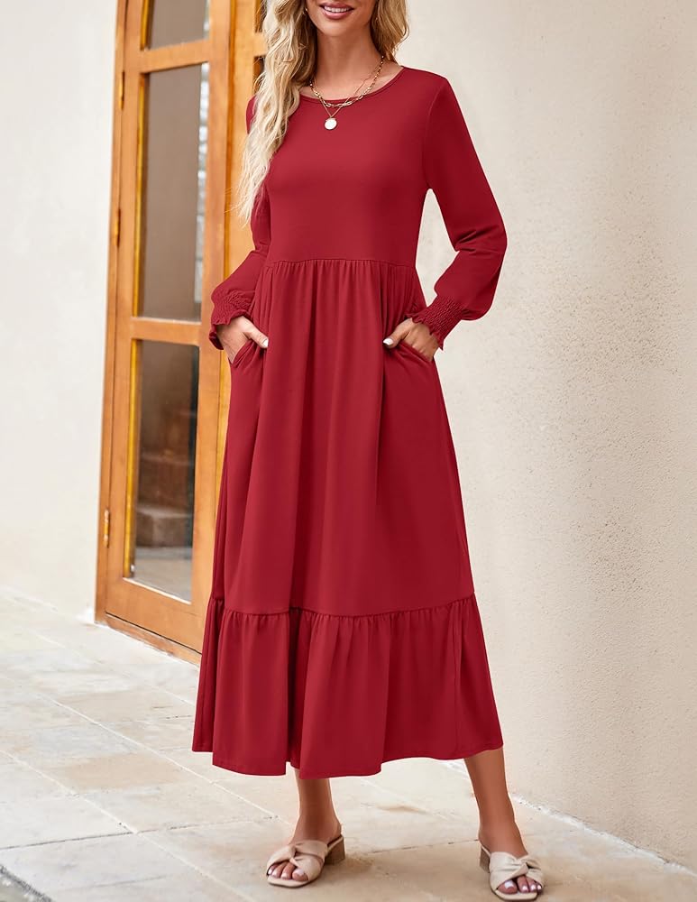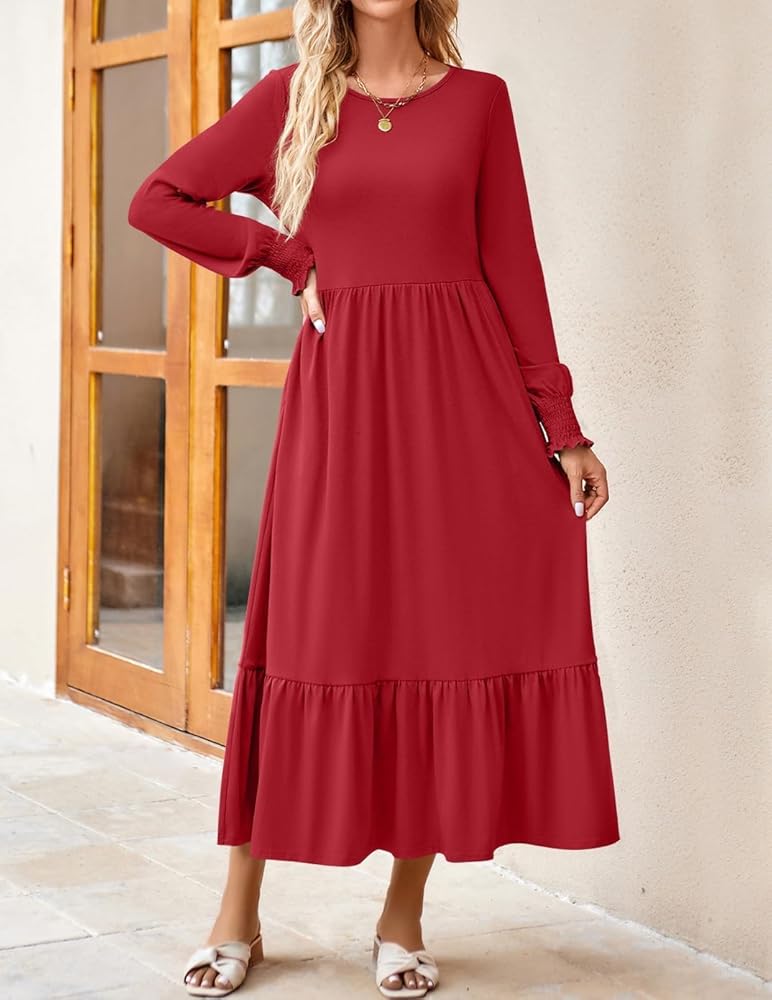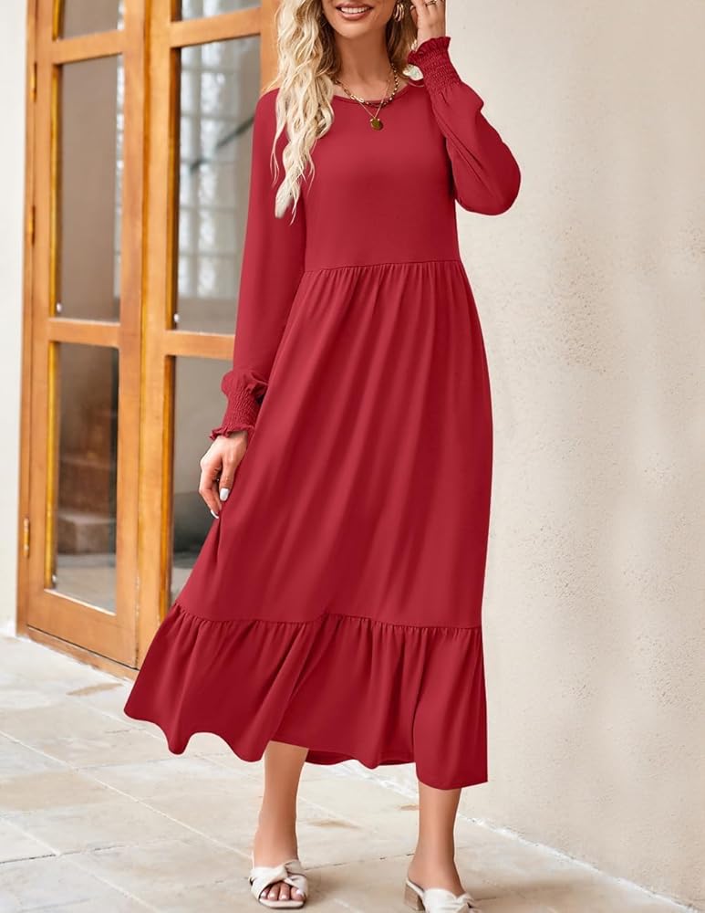 A closet must-have fall dress you can't miss! This casual dress features a classic round neckline, long sleeves with cute smocked cuffs, an elastic high waist with a flowy ruffled tiered midi skirt and two side pockets.