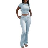 Fabric:2 piece outfits for women, 92%Rayon, 8%Spandex.this set is made of breathable materials that ensure comfort even on hot summer days.The short sleeves of the top provide a cool and relaxed feel,while the Low Rise Flare Pants offer a snug fit.