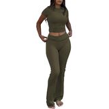 Design: Round neck,cropped length, bodycon,low rise,and slight flare.The Short-Sleeve Crop Top and Low Rise Flare Pants are designed to accentuate your curves while providing ultimate comfort.