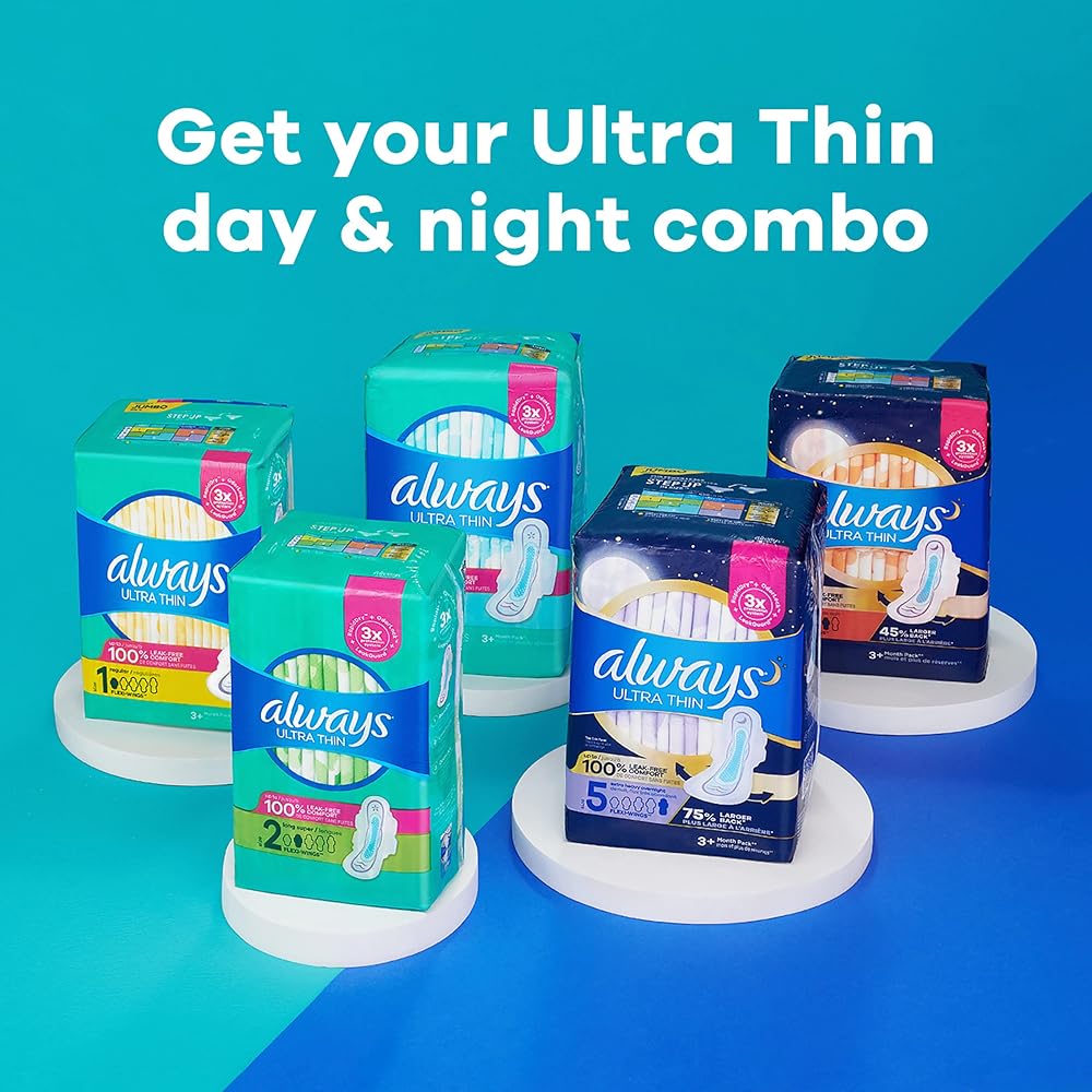 Always Ultra Thin Overnight Pads with Flexi-Wings provide you a PERFECT NIGHT SLEEP with 75% more coverage on the back for up to 100% Leak Free Comfort, no matter how you sleep. All Always Ultra Thin Pads have our 3x Protection System to give you peace of mind day and night. RapidDRY technology absorbs gushes 2X faster than the leading store brand. The LeakGUARD core locks in leaks for long-lasting protection. Plus, OdorLOCK that helps prevent unwanted odors to help you feel fresh and clean throughout your day! Plus Always Ultra Thin Pads come in a range of sizes from 1 to 5 to fit your flow and size perfectly. If you have a light flow or need a teen-sized pad, then we would recommend using our Always Ultra Thin size 1 to 3. If you have a heavy flow or want overnight protection, then we recommend using our size 4 or 5 Ultra Thin Pad. Additionally, all Always Ultra Thin packs are made of 50% recycled plastic and are made at a site that purchases 100% renewable electricity. Remember that all Always Ultra Thin Pads are available in five sizes to fit your flow for 100% leak free comfort.
