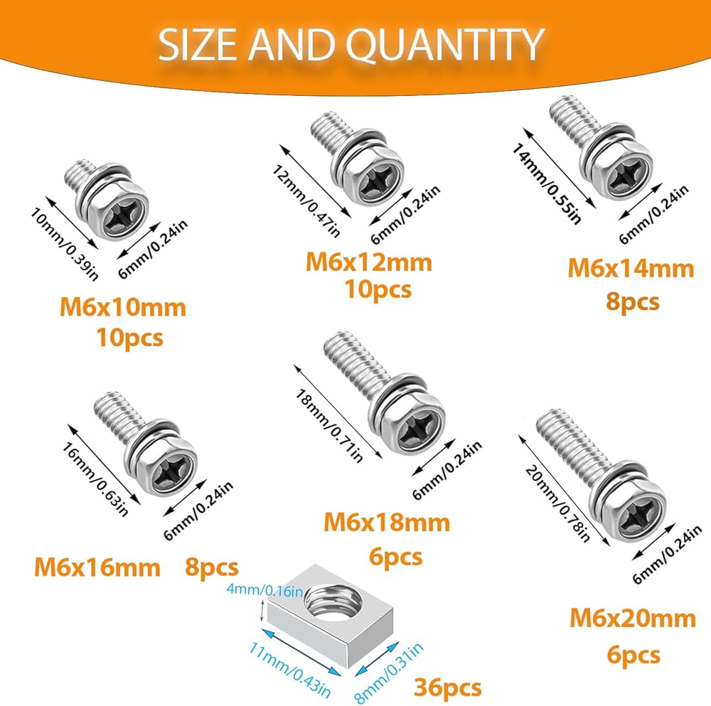 Hincell 96Pcs 304 Stainless Steel M6 x 10/12/16/18/20mm Motorcycle Battery Terminal Bolts and Nuts with Square Nuts Assortment Kit