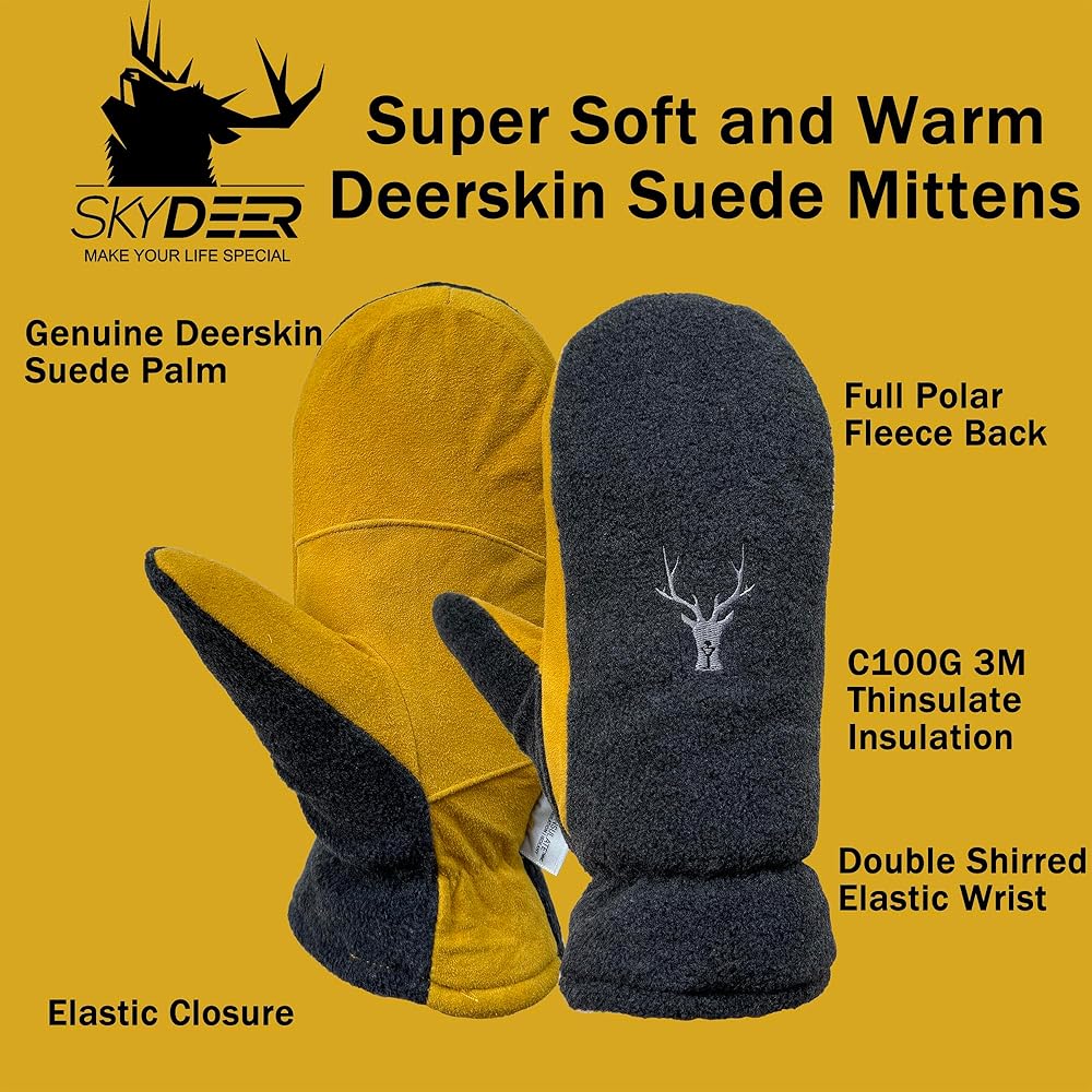 [ Windproof and Thermal Polar Fleece Back ] - This SKYDEER Deerskin Winter Mittens can protect your hands against wind and light snowmelt in sports. Polar fleece back is windproof, comfort and warmth. All materials are skin-friendly and moisture-wicking layers inside keep your hands sweat-free