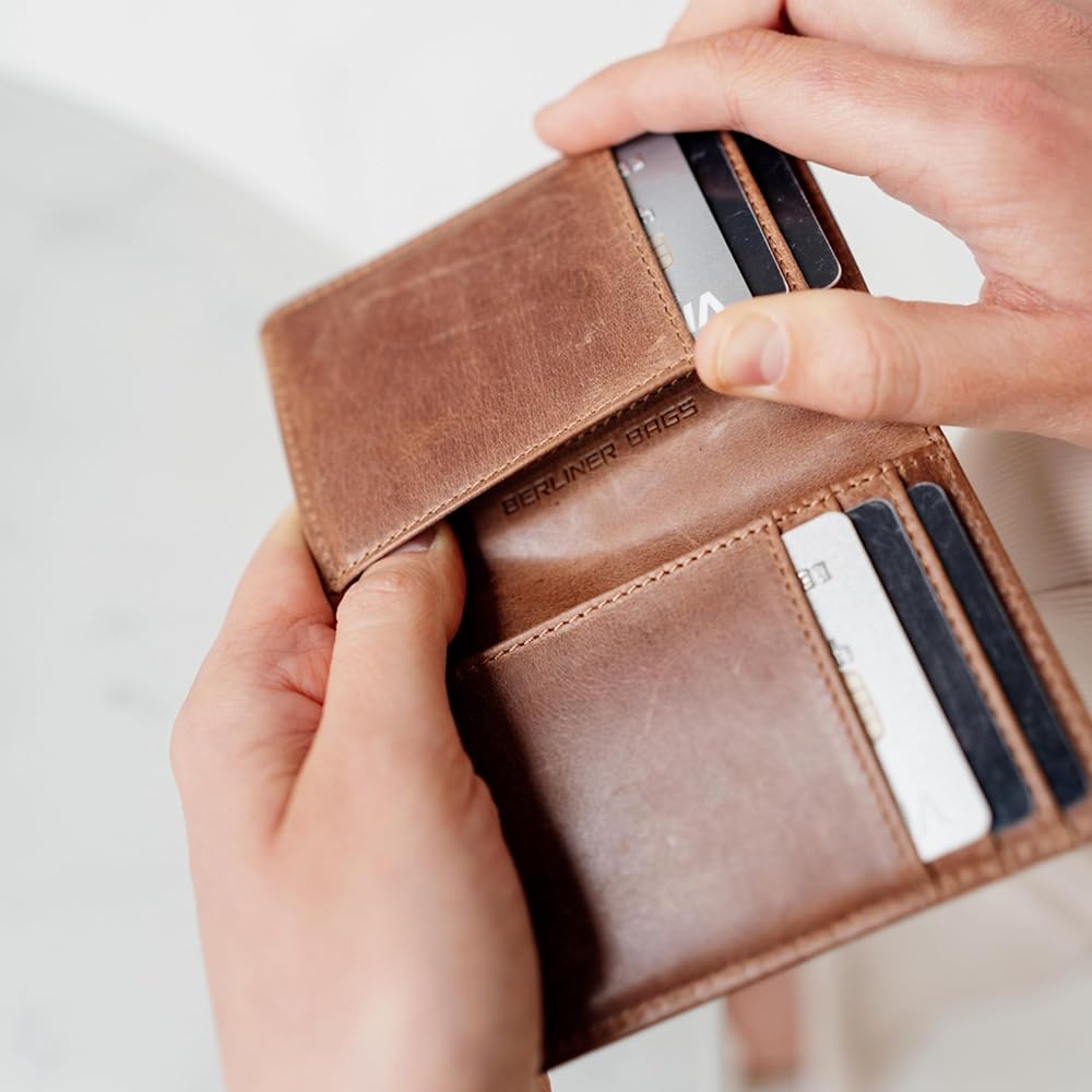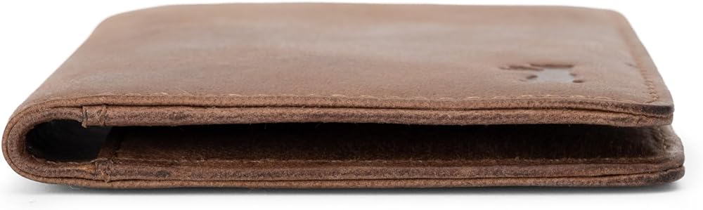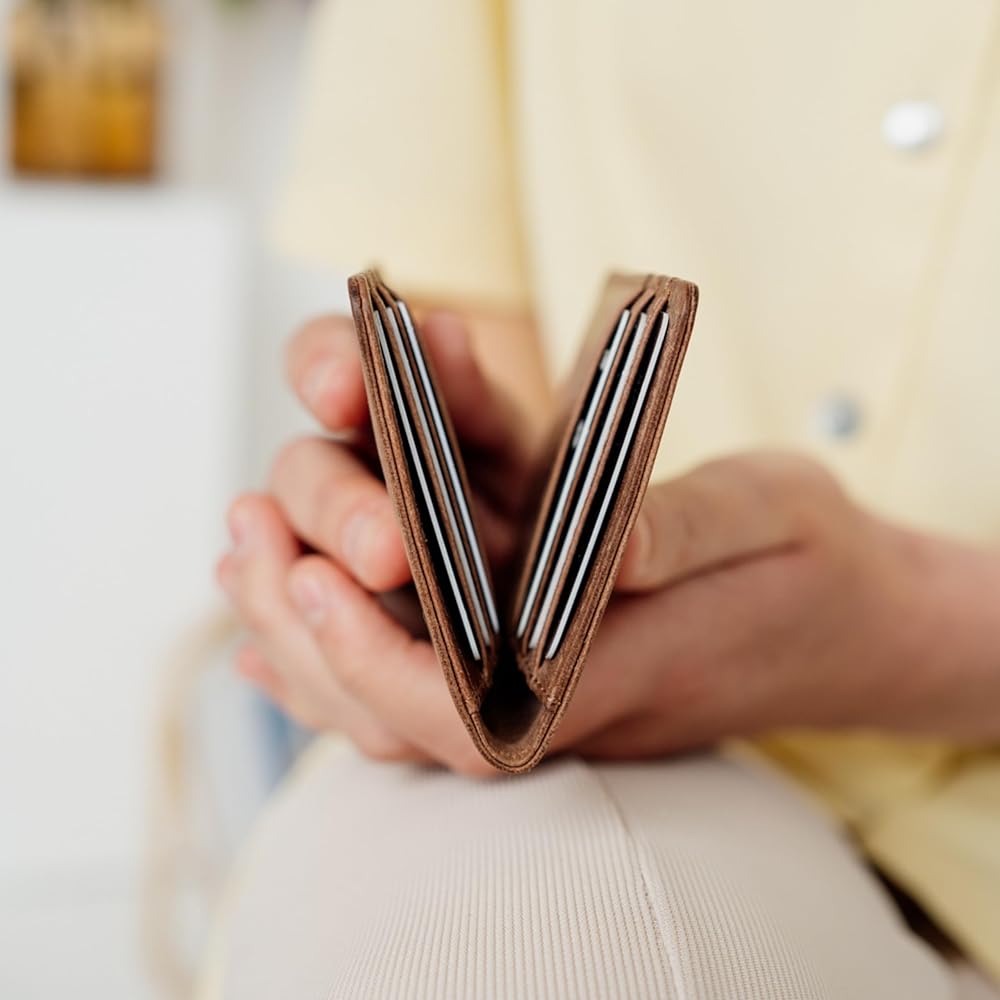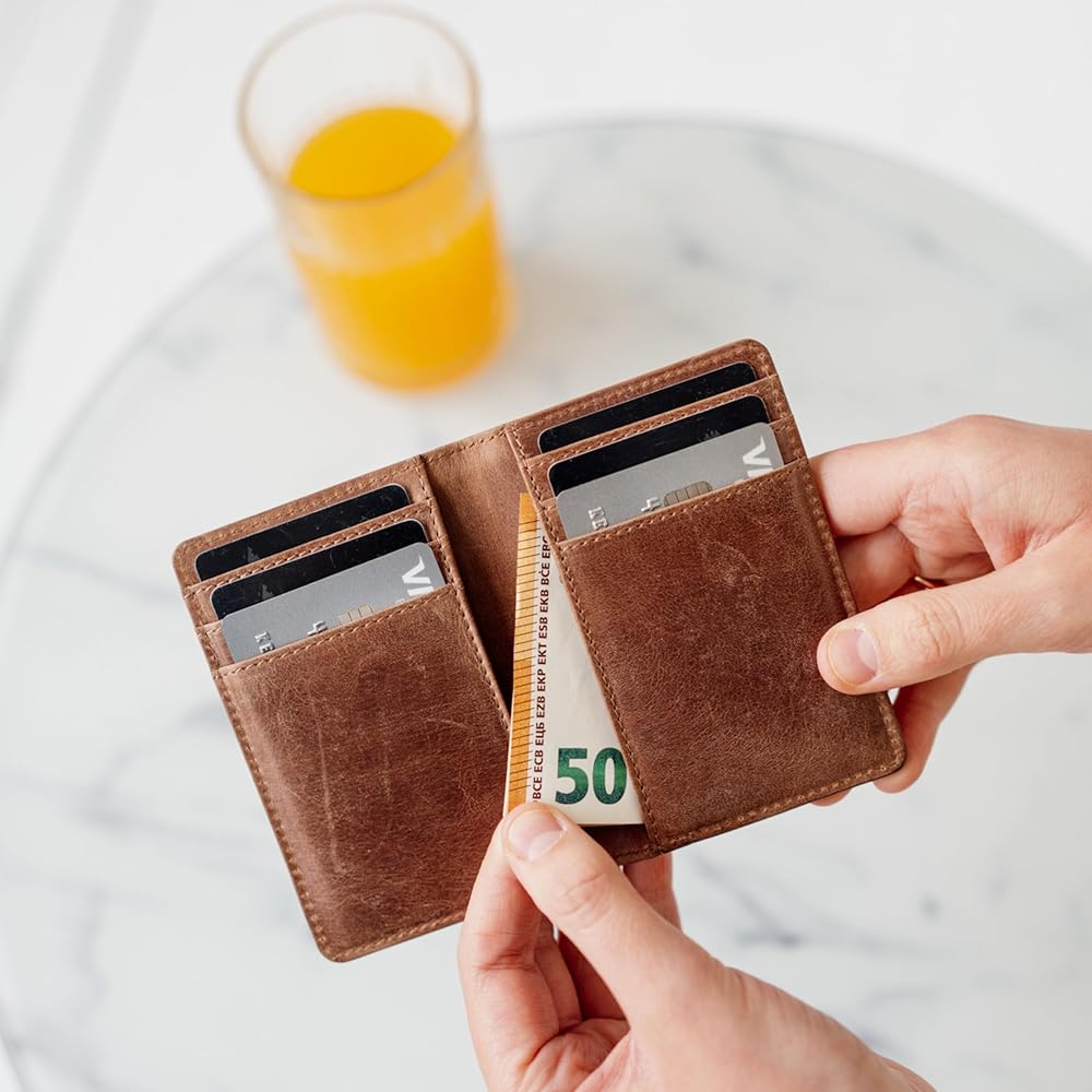 SLIM & PRACTICAL DESIGN. The Porto bifold card holder is a stylish and functional choice for everyday use. Its sleek, slim design makes it perfect for both men and women, easily fitting into your pocket or small purse. Despite its slim profile, this card wallet offers space for up to 6 cards and folded bills in its two side slip-in pockets. Dimensions: 4.3" x 3.1" x 0.8".