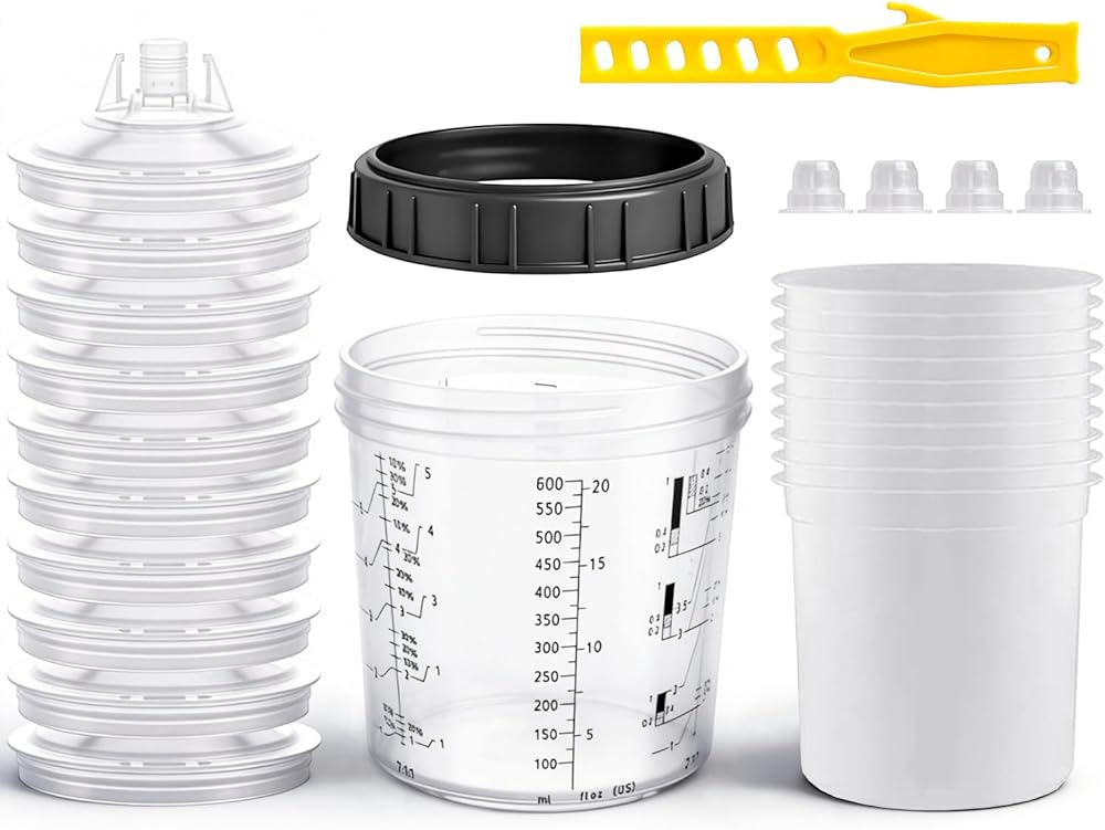 【Easy to use】Our disposable cup system can be used with almost any brand of spray gun. The plastic measuring cup has only three parts for easy installation, and has a clear scale, which can determine the mixing ratio of common paint systems, and the transparent color is easy to see the liquid level.