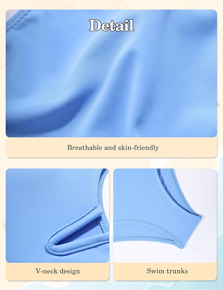 Design: Cutout kids bathing suits girls top with v-neck design with double straps, removable padding to protect girl's privacy, let every girl show her unique style. The solid color swim trunks are designed with drawstring tie waist and high waist, more comfortable to wear