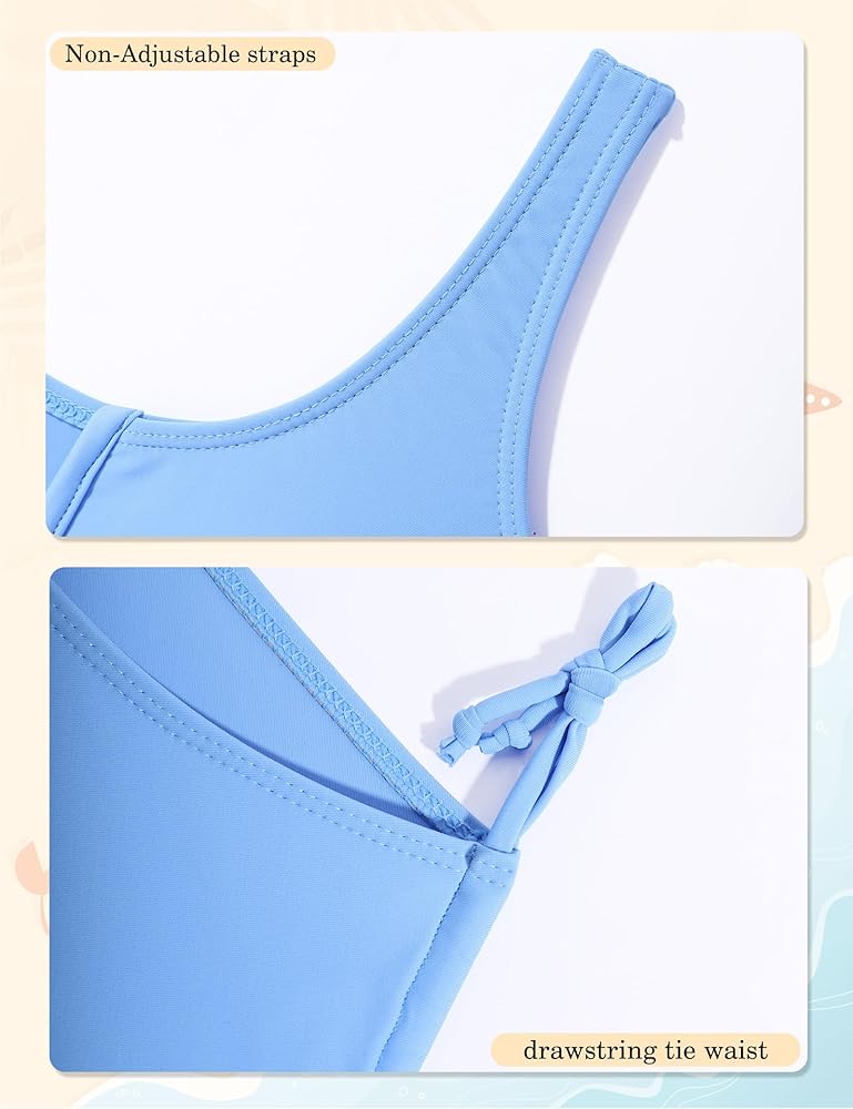 Material:Our girls swimsuit are made of polyester and elastane, girls 2 piece swimsuit combines security, comfort, and style. This girls bathing suits with premium lined, not see through when get wet. The girls' swimwear, paired with swim bottoms, not only offers a fashionable appearance but also ensures reliable protection for girls