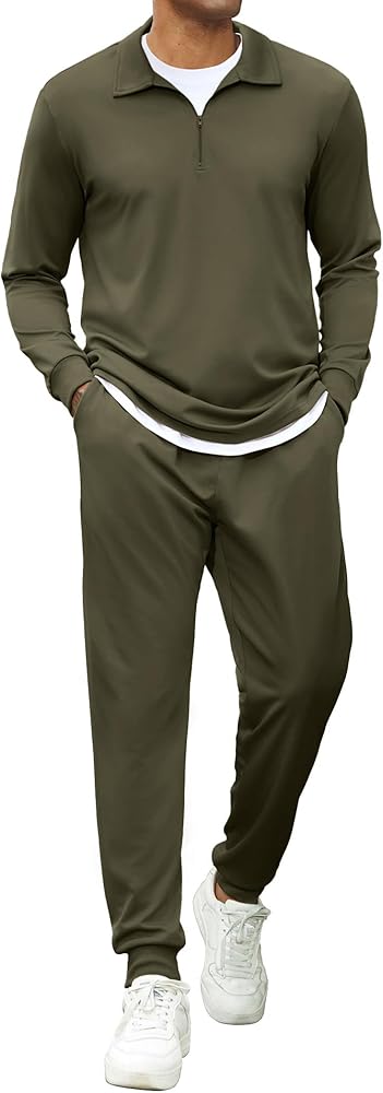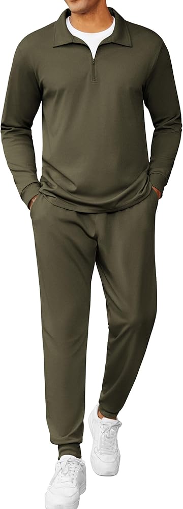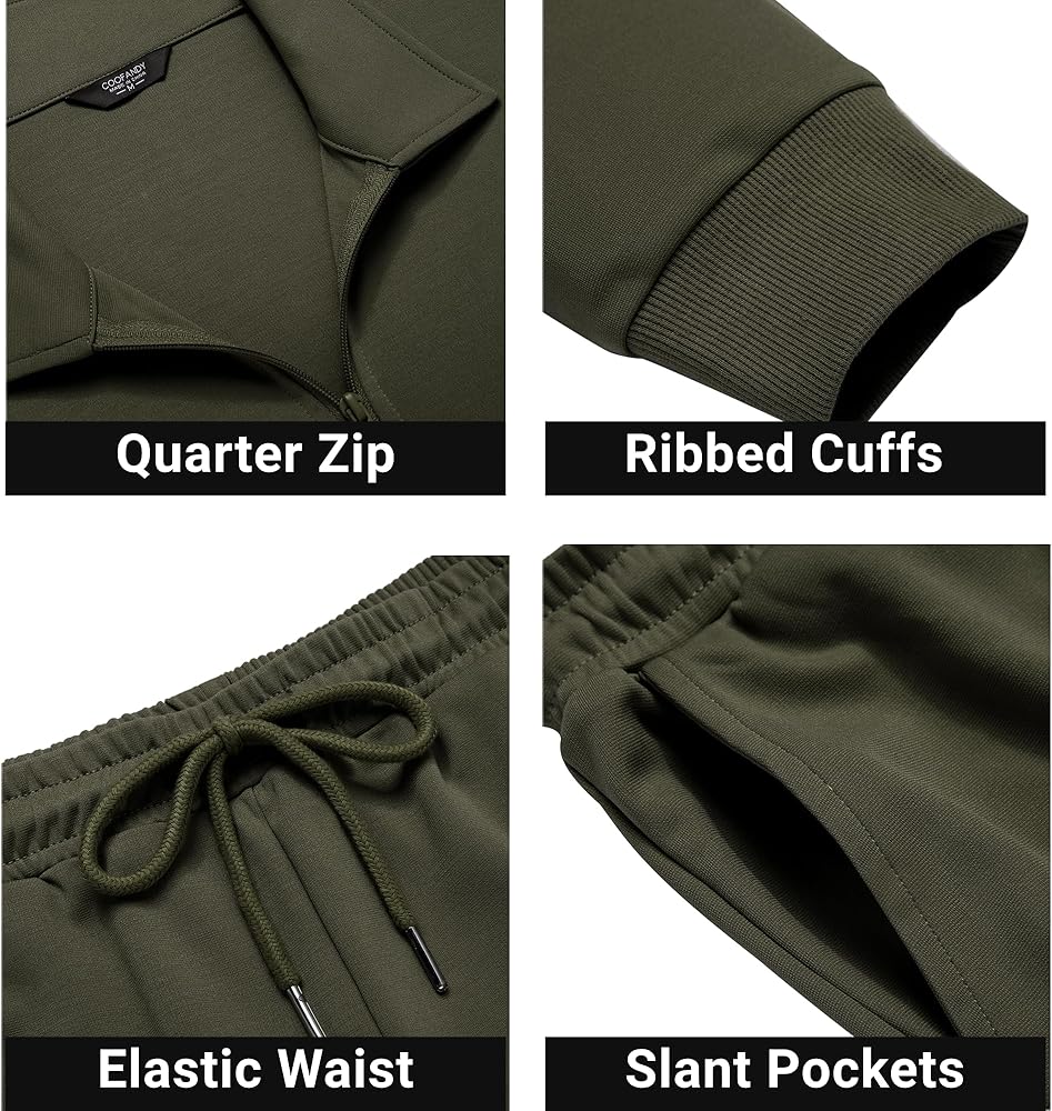【2 Piece Tracksuits】: Mens sports suit top featuring with quarter zip, long sleeve, and elastic ribbed cuffs seal in warmth. The mens jogging sweatpants with ribbed ankle trousers, it has simple style, elastic waist design with a drawstring to provide optimal range of motion when exercising. Double-sided slant pockets provide a much safer place to store your keys, cellphone, earphones, cards, etc. Convenient for workout.