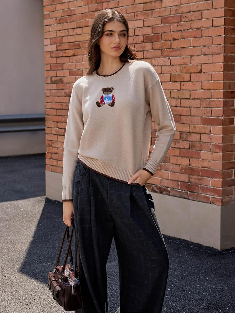 Stylish Graphic Design: The cute cropped fall sweaters for women 2024 feature an adorable bear graphic on the front, enhancing its visual appeal and making it perfect for casual outings, school, and daily wear