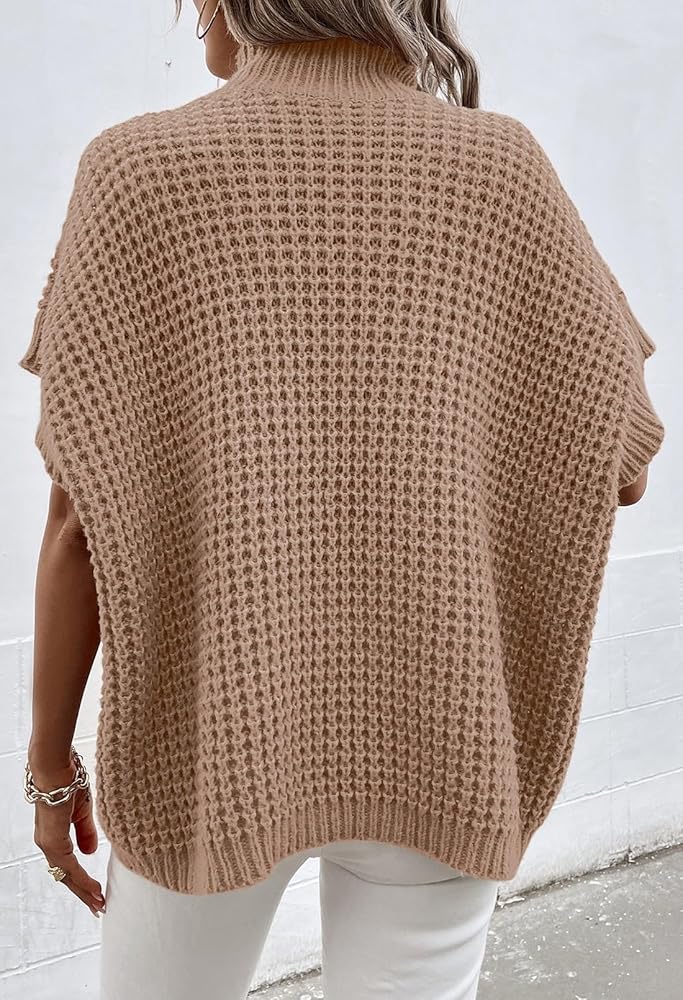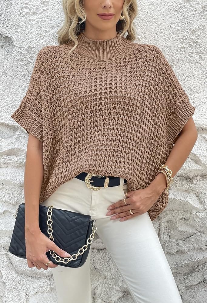 Mock neck batwing short sleeve sweater vest top with ribbed hem, suitable for all body shape