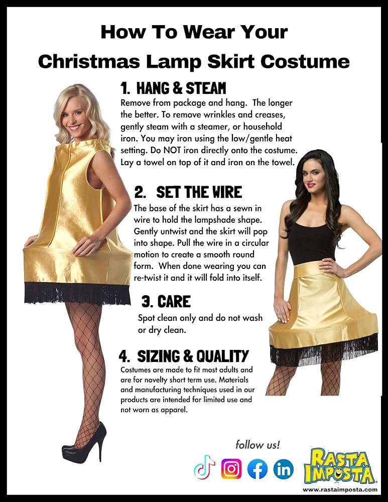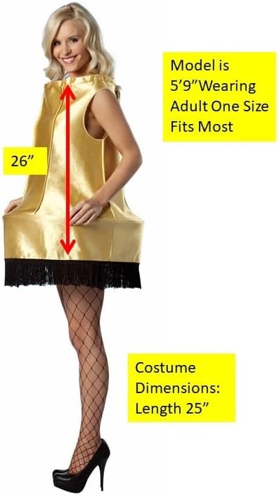 Christmas Lamp Adult Costume Put on this Sexy Christmas Lamp Costume and give off the soft glow of electric---fun! This is no ordinary lamp costume, it's a major award! Costume features a polyfoam gold metallic dress shaped like a lamp shade. The dress is trimmed with black fringe and has a plastic hoop at the bottom to keep the shape. Available Sizes: Fits women sizes 4 to 10. Add your own fishnet tights and sexy high heels to complete the look. This clever costume is perfect for Halloween parties, Christmas parties and more!