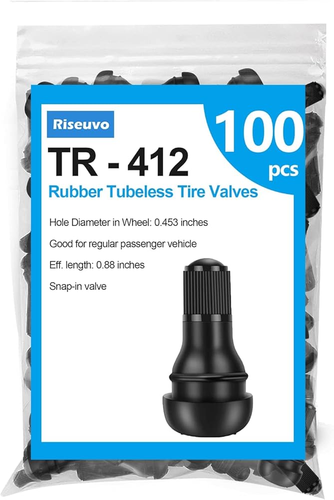 Quantity & Size - Riseuvo TR412 valve stems for tubeless 0.453” (11.5mm) diameter rim holes, these tire valves are 0.88" long (effetive length) and snap in easily to your tires., package contains the 100pcs rubber snap-in valve stems.