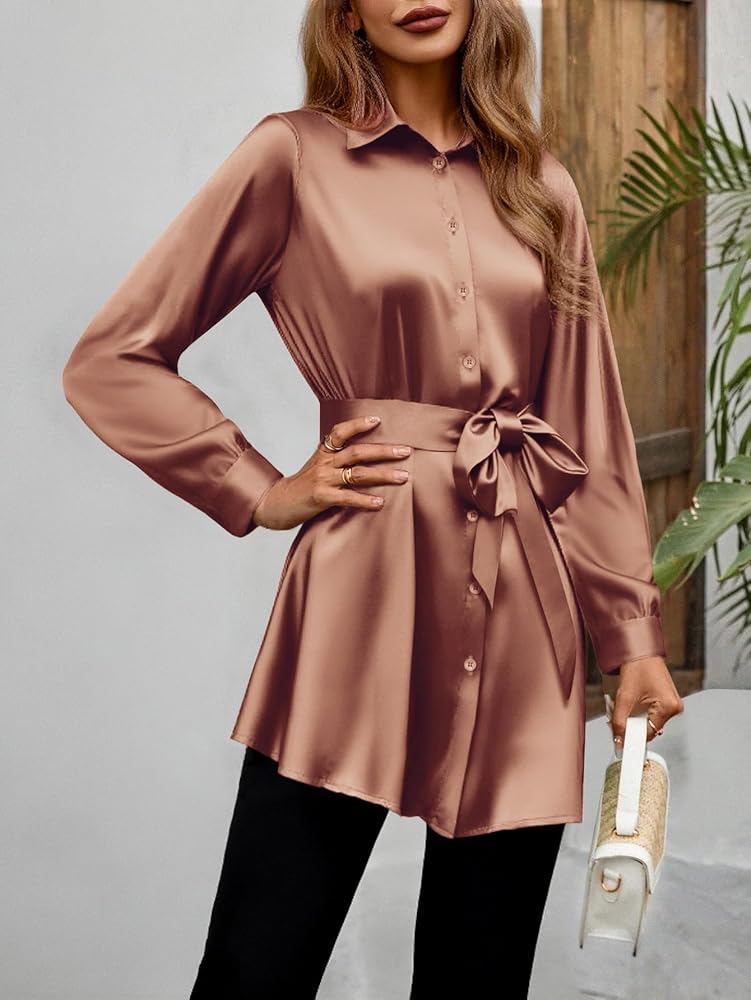 【Mulit-Wearing】 :Satin Shirt Dress With Belt Perfect Pairs With Flats/Heels; Also As A Button Down Shirt Pairs With Denim Shorts/Casual T-Shirt;And Can Be Worn As A Beach Cover Up,Perfect Spring,Summer.Autumn