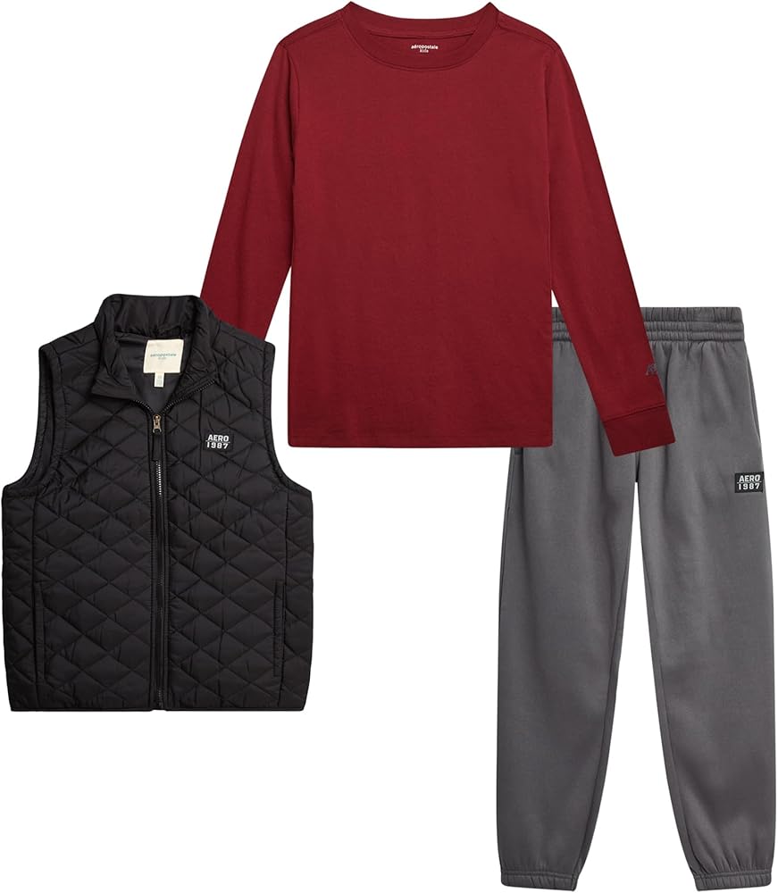 Elevate your boy's wardrobe with a versatile 3-piece outfit designed for style, comfort, and functionality. This set includes a cozy zip-up hoodie, a trendy vest, and matching jogger sweatpants, offering endless outfit combinations that are perfect for any occasion. Whether he's heading to school, playing outdoors, or relaxing at home, this activewear set has him covered. Made from a premium blend of cotton and polyester, the zip-up hoodie and jogger sweatpants provide superior softness and breathability, ensuring your child stays comfortable throughout the day. The hoodie features a full-length zipper, making it easy to layer or adjust as the weather changes. The jogger sweatpants are designed with an elastic waistband, providing a secure and comfortable fit that moves with him. The stylish vest adds an extra layer of warmth, perfect for cooler days when he needs a little more coverage. Its modern design complements the hoodie and joggers, creating a polished look that's both trendy and functional. Whether worn together or mixed and matched with other pieces in his wardrobe, this set offers the versatility and practicality that every active boy needs.AEROPOSTALE is known for its commitment to quality and style, and this boys' sweatshirt set is no exception. With its durable construction and thoughtful design, it's built to withstand the wear and tear of everyday adventures. Ideal for boys who love to stay active while looking sharp, this set is a must-have addition to his collection of boys' fashion hoodies and sweatshirts. Give your child the gift of comfort, style, and versatility with the AEROPOSTALE Boys' Sweatshirt Set. Perfect for layering, playing, and exploring this 3-piece set is designed to keep up with his busy lifestyle while keeping him looking his best.