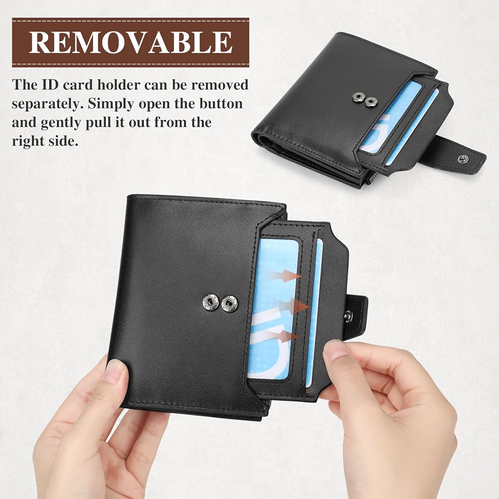 Capacity display: This men's wallet has 18 card slots for credit cards, debit cards, bank cards, ID cards and more; 2 large bill compartments for cash, bills, receipts and coupons; 1 zippered pocket for coins; and finally 2 clear ID windows ideal for your driver's license.Men's zipper wallet measures 5.12 x 3.94 x 1.18 inches. The small size large capacity men's wallet can be carried in a shirt pocket or bag.