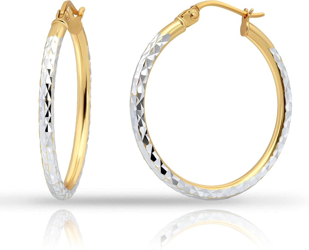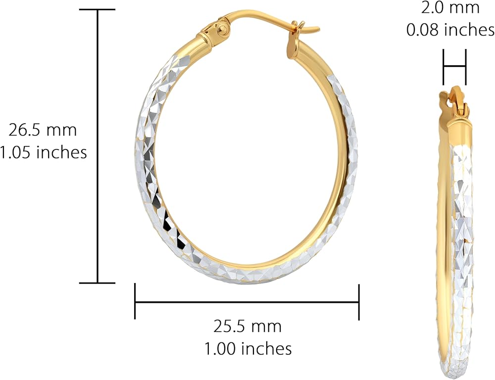 JEWELRY SPECIFICATION – These diamond-cut click-top hoop earrings come in sizes 15mm - 50mm. Hoop Thickness: 2mm (1/16 inch). Each pair features a beautiful diamond-cut design with sturdy click-top clasps for added comfort and security. Our stylish eye-catching earrings are Lightweight, High Polished, Perfect for All Day Wear and Any Occasion.