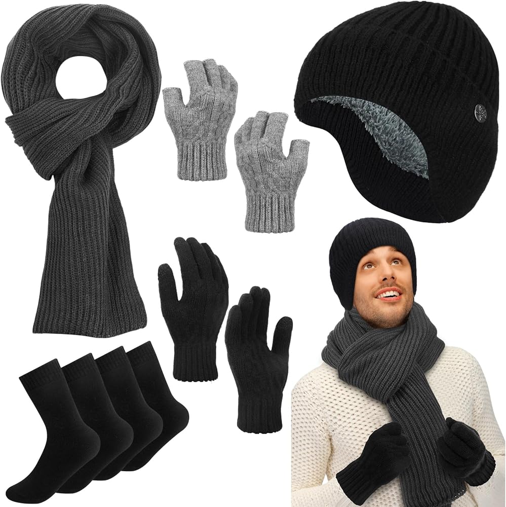Practical 8 Pcs Set: you will get 1 winter earflap and warm hat, 1 knitted scarf, 1 pair of full-finger touchscreen gloves, 1 pair of half-finger touchscreen gloves, and 4 pairs of socks; This practical set designed for men is one size fits all, and it can meet your needs to stay soft during winter activities