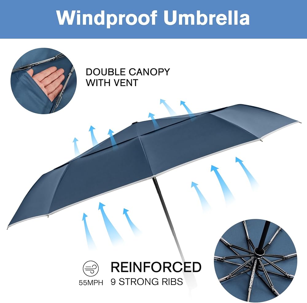 【Unmatched Wind and Superior Sturdiness】The windproof umbrella is added with a vent, and the double canopy allows wind to pass through. The frame is made of 9 super-strong reinforced fiberglas ribs. It is safe to withstand even in bad weather and will not break after being flipped over by a hurricane.
